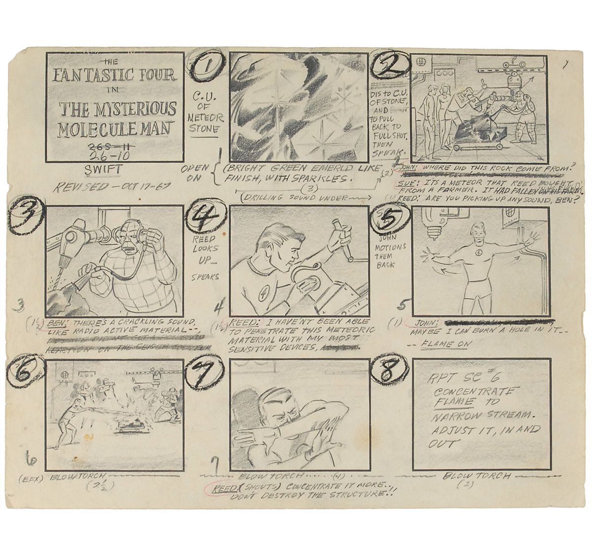 (Hanna-Barbera Studios, 1968) Original complete episode of production storyboard drawings from Fantastic Four, 30 pages, each featuring nine panels, for the episode entitled “The Fantastic Four in The Mysterious Molecule Man.” Accomplished in graphite on untrimmed 12.5 x 10 illustration paper. The story follows the Fantastic Four as their study of a radiated meteor is interrupted when the Molecule Man appears and threatens the public. In the action-packed sequence, the Fantastic Four pursue the Molecule Man and use a piece of the meteor to defeat his superpowers and return him to his normal human form. The storyboard has various notes and revisions throughout, including some in the hand of Joe Barbera. Hanna-Barbera’s 1967–68 TV show was the first animated series based on Marvel’s Fantastic Four comics and lasted just 20 episodes, with this airing as the 17th on January 13, 1968. Complete storyboards from Fantastic Four are excessively rare, and this is just one of three complete storyboards known to exist at present.