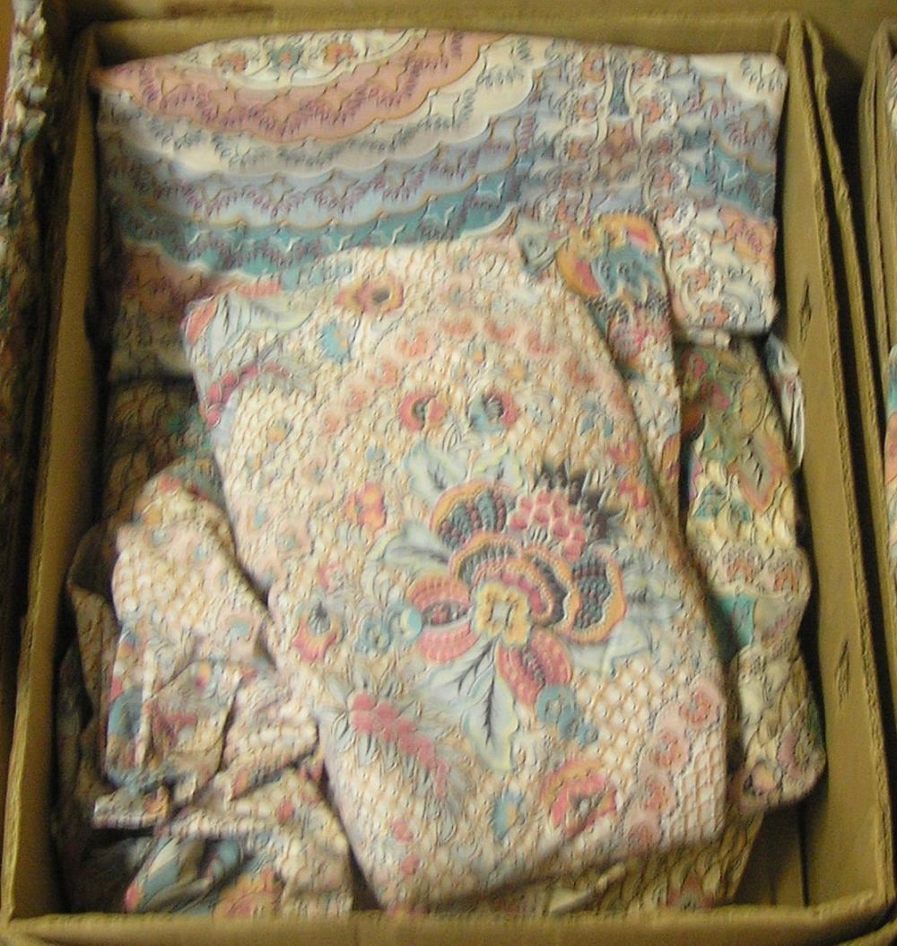 Complete king size bedroom linen set with matching magazine basket and loads of accessories, classic 19th century style wood block print by Martex, more then 2 large box fulls est. value $225.00-$250.00