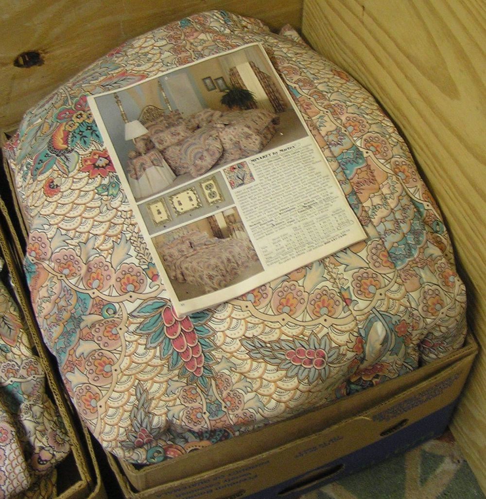 Complete king size bedroom linen set with matching magazine basket and loads of accessories, classic 19th century style wood block print by Martex, more then 2 large box fulls est. value $225.00-$250.00