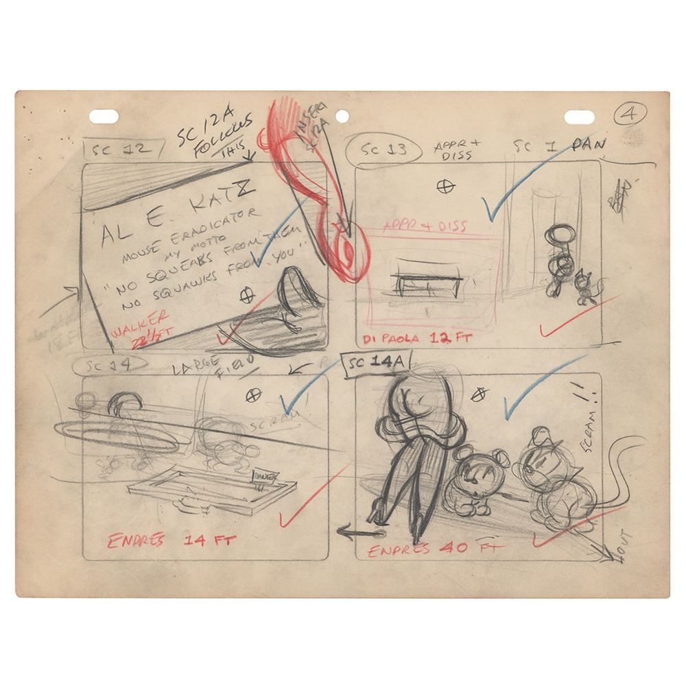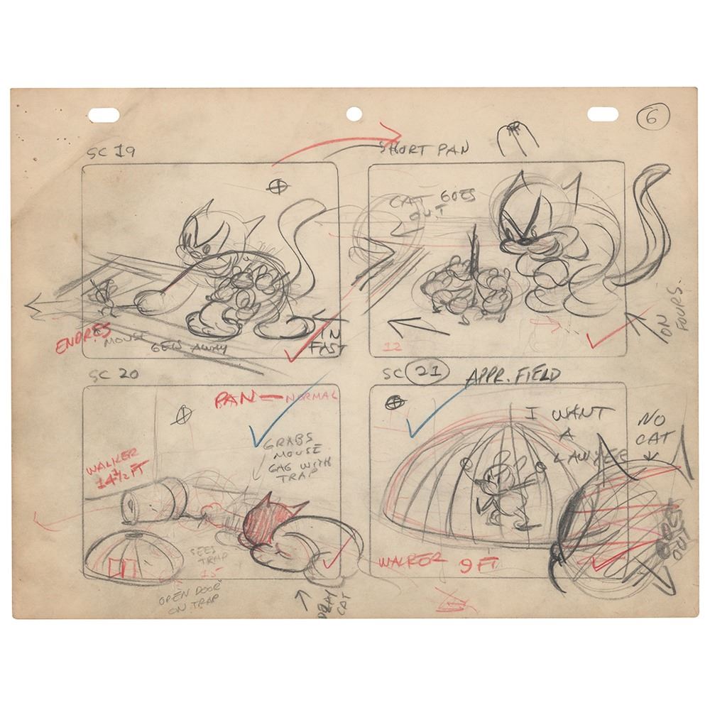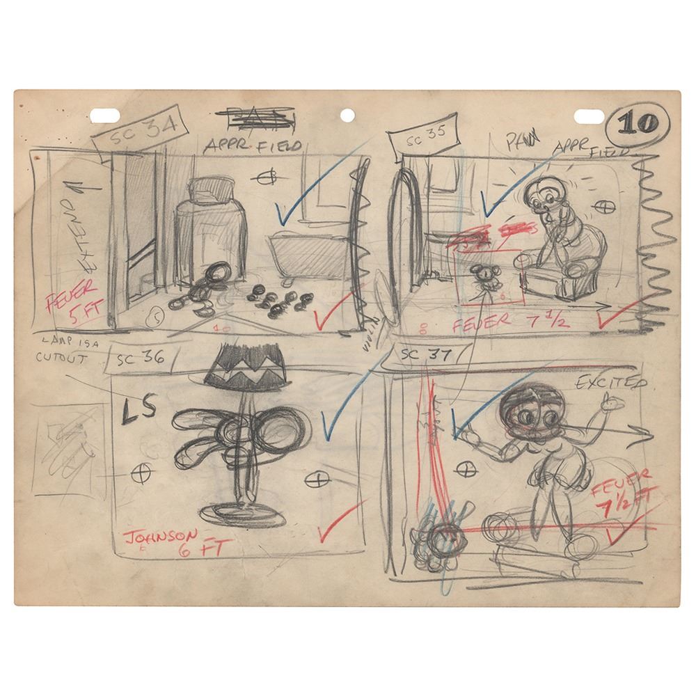 (Fleischer Studios, 1938) Original complete 14-page hand-drawn storyboard for the Betty Boop and Pudgy the Watchman short film Pudgy the Watchman, which was released on August 12, 1938. The storyboard contains 14 pages and a total of 49 drawings, with the majority bearing scene notes and directions. Each storyboard page is accomplished in graphite and colored pencil on untrimmed 11 x 8.5 animation paper; the lone exception being the opening or title page, “BY-12, in Pudgy the Watchman,†with upper border marked “Footage Totals,†“Final Record,†and “Bonus!†The sheet lists the first names of the five cartoonists—“Tom,†“Harold,†“Frank,†“Otto,†and “Tonyâ€â€”their starting dates, their scenes, and the footage totals. In overall fine condition, with some small tears and scattered creases, and tack holes to the upper corner of each page.