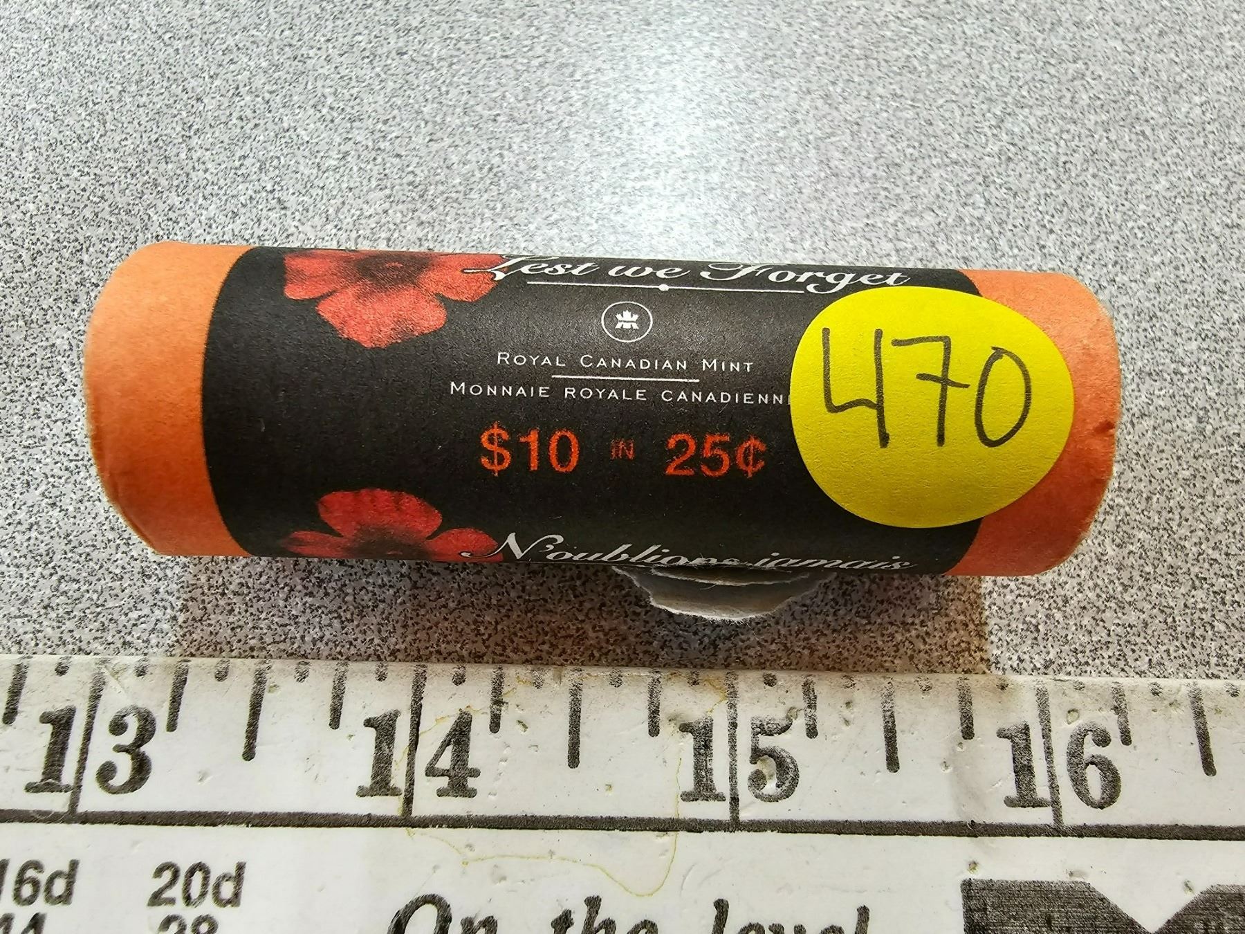 Complete roll of 2004P Canadian Lest We Forget Colourized 25 Cents.