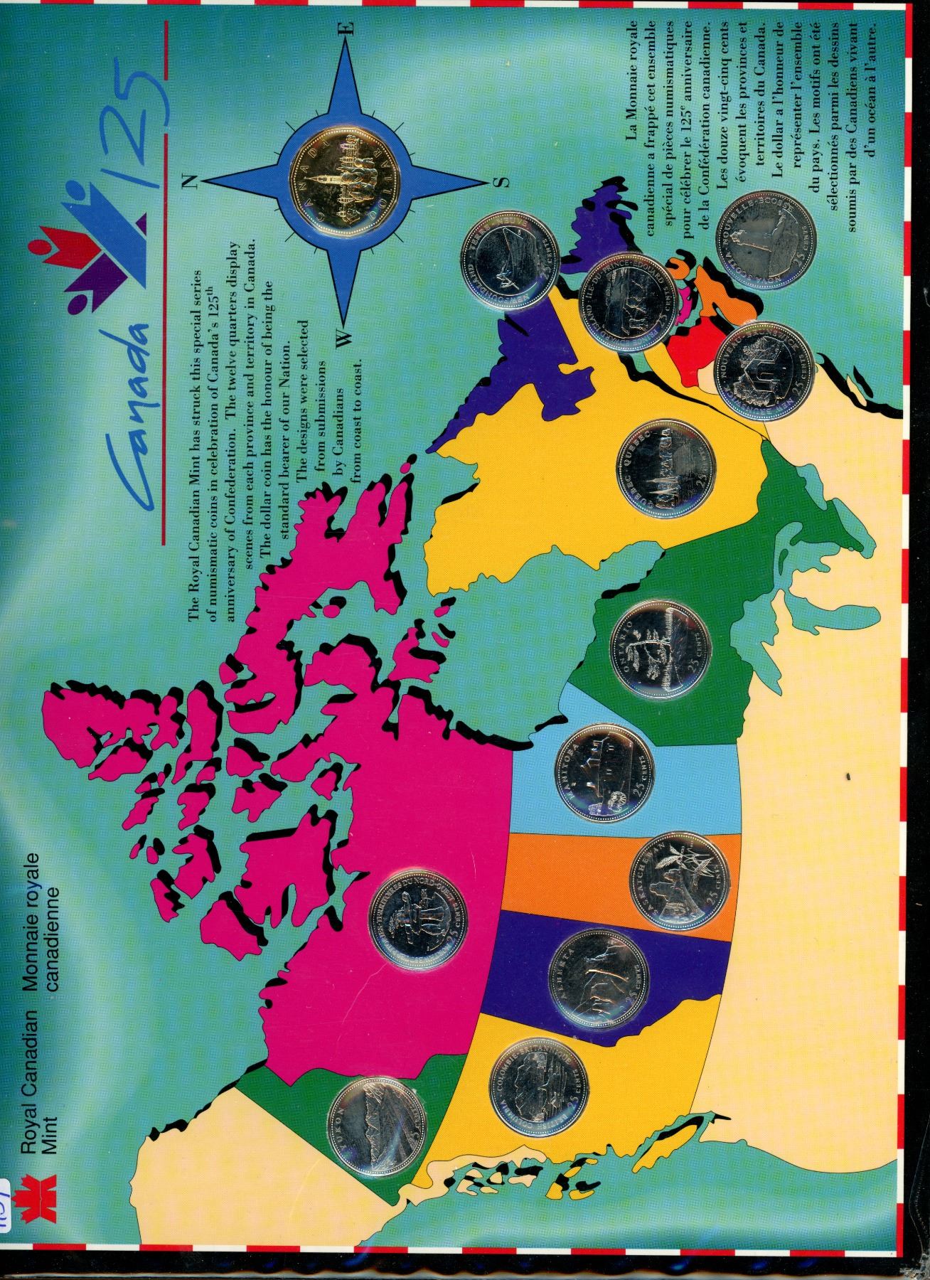 Complete set of 12 1992 Provincial & Territorial 25 Cents plus one special loonie that commemorates the 125th Anniversary of Confederation. Housed in its original Royal Canadian Mint holder.