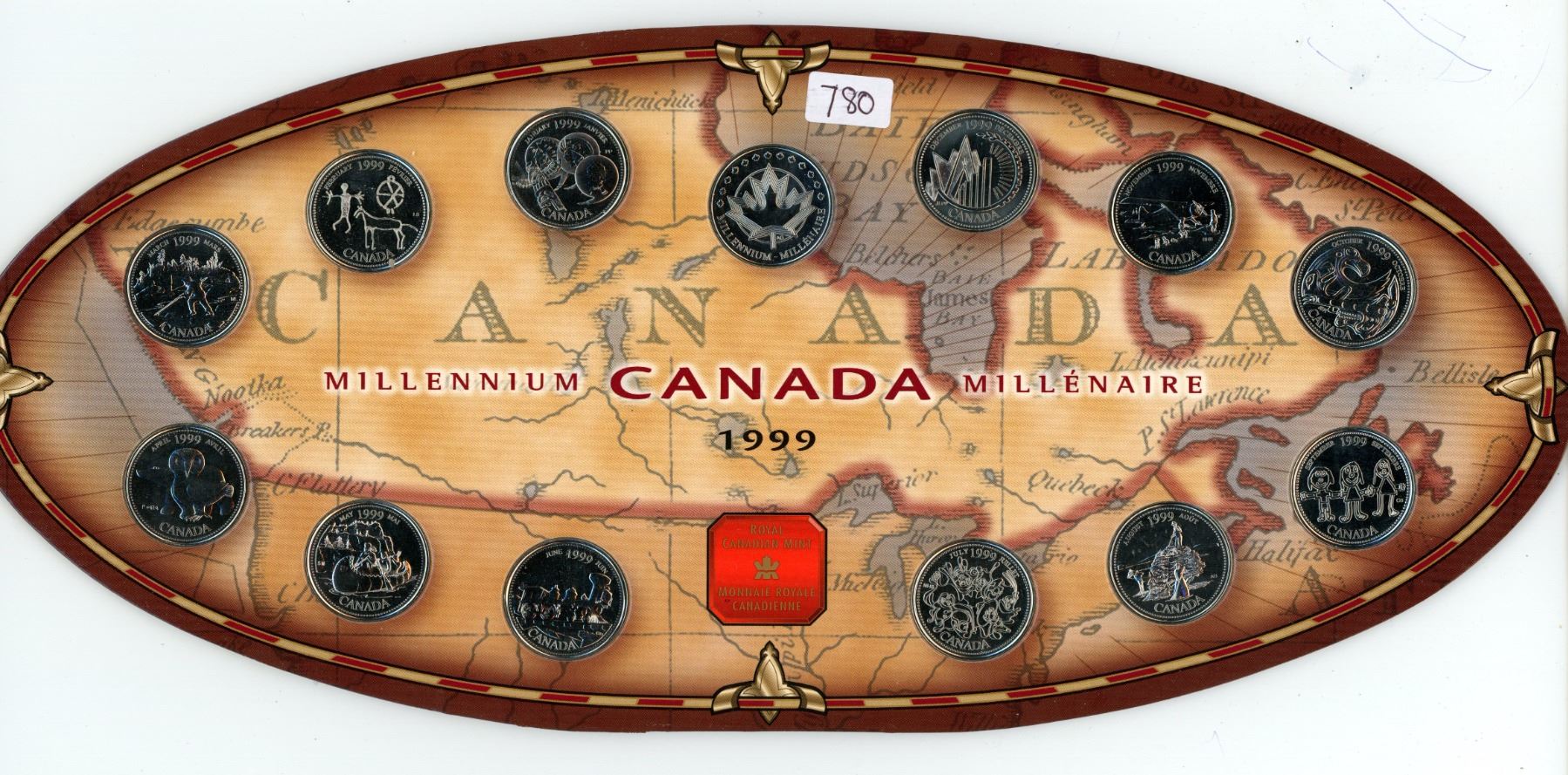 Complete set of 12 Canadian 1999 Millennium 25 Cents. Includes Mint Medal that was only available in this set. As issued by the Royal Canadian Mint.