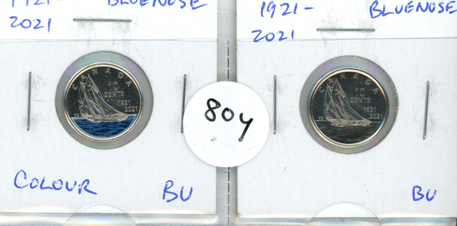 Complete set of 1921 – 2021 Bluenose 10 Cents. Includes Colourized & Regular. Both are BU from original rolls.