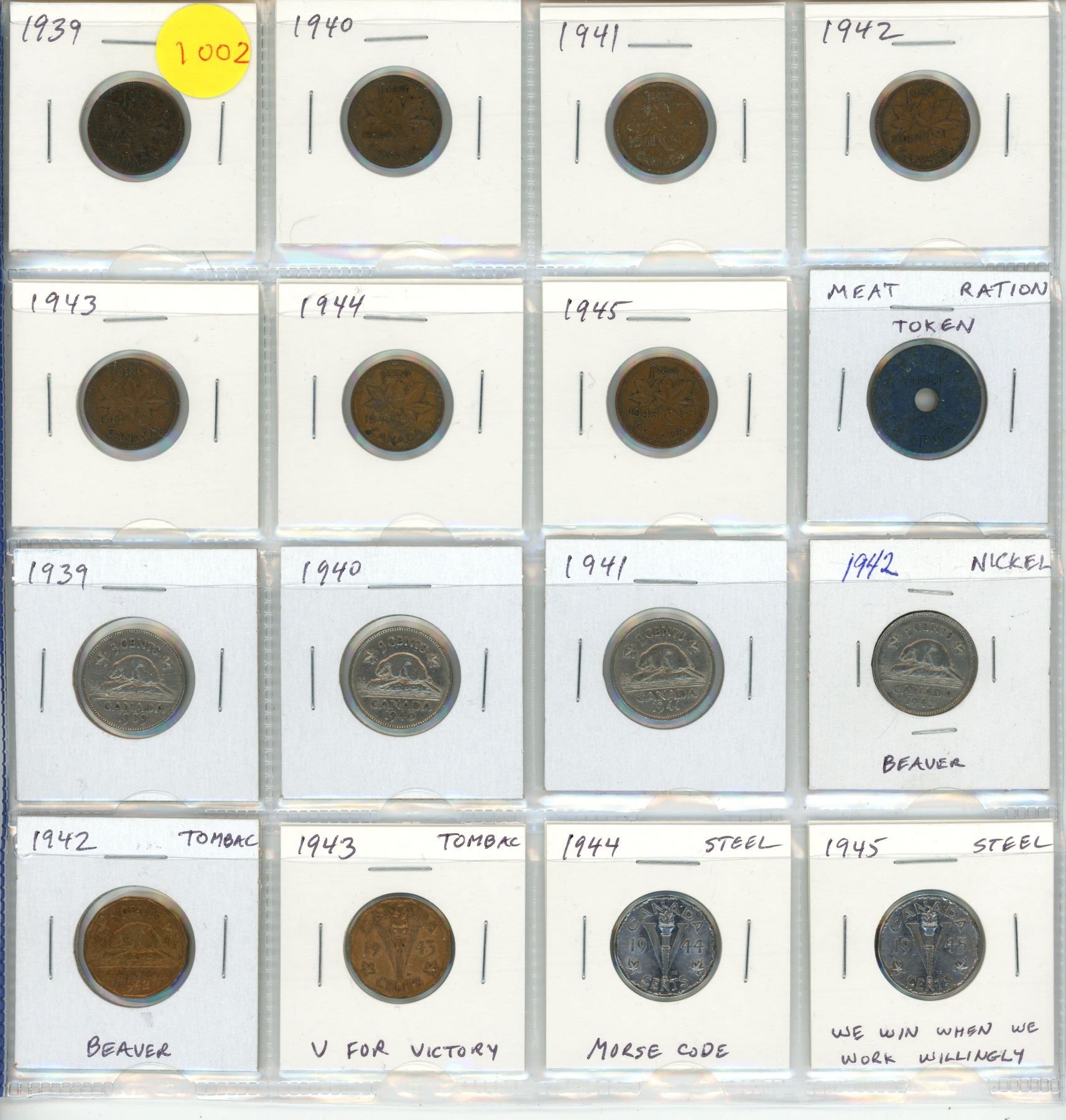 Complete set of 1939 – 1945 Canadian World War II Small Cents & Nickels, including both Tombacs & Steel coins. Coins grade F – EF.