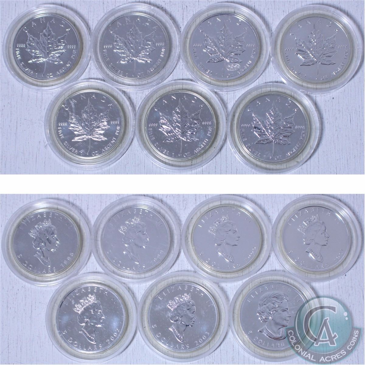 Complete set of 1998-2004 Canada 1oz Silver Maple Leaf coins (TAX Exempt). Some coins contain natural toning. You will receive one of each date from 1998 to 2004. 7pcs