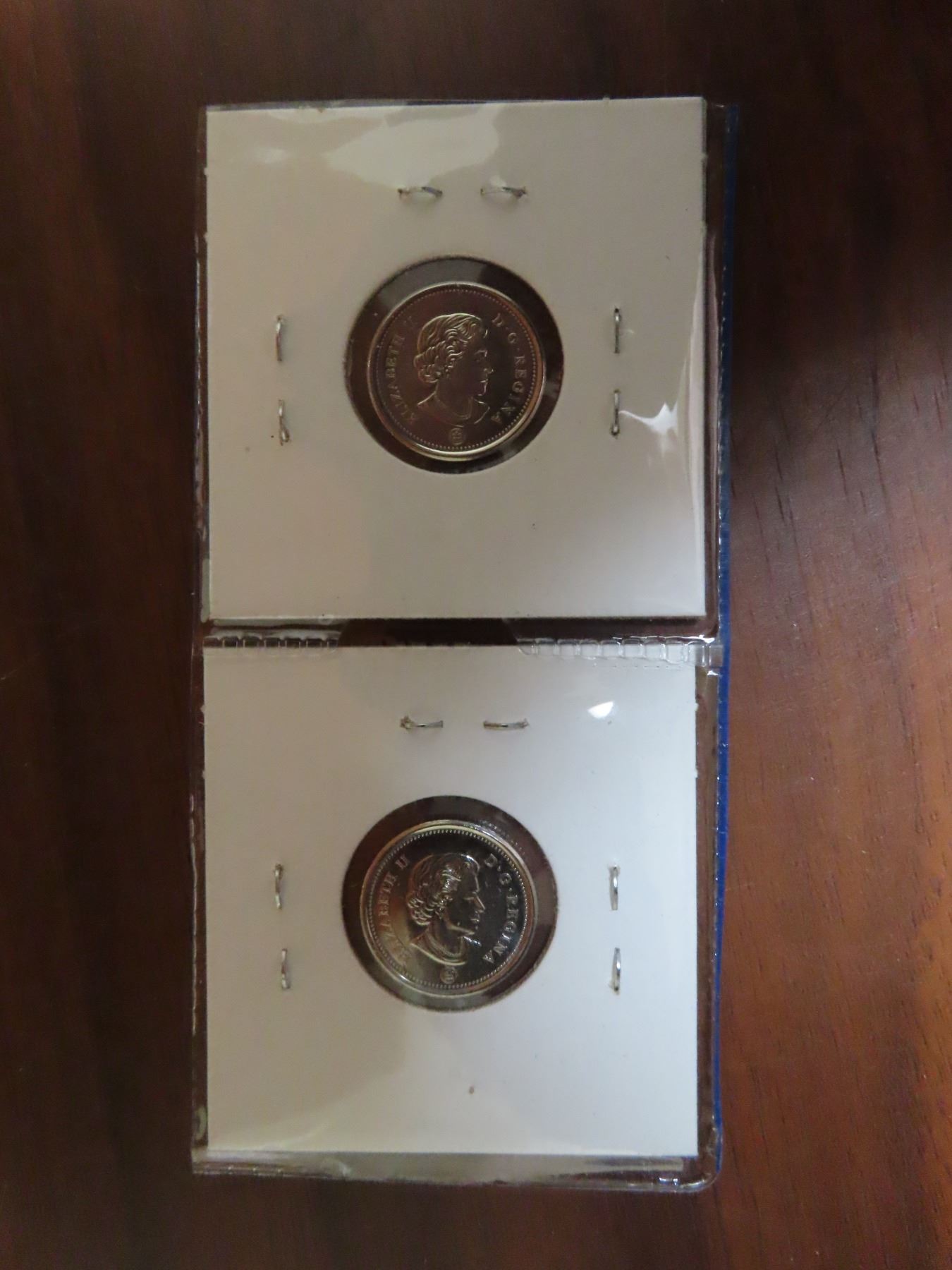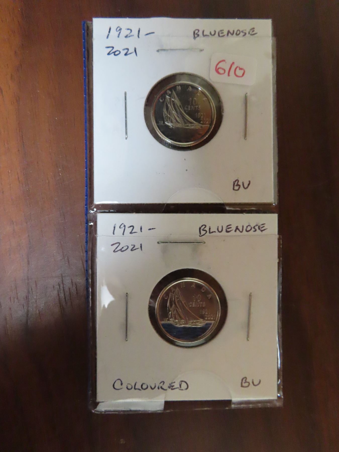 Complete set of 2 1921 – 2021 Bluenose 10 Cents. Includes Colourized & Regular. BU from an original Royal Canadian Mint roll.