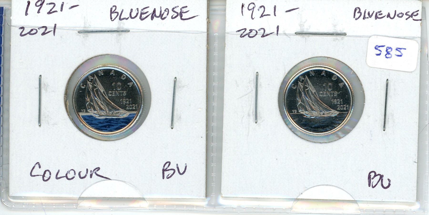 Complete set of 2 1921 – 2021 Bluenose 10 Cents. Includes Colourized & Regular. BU from original rolls.