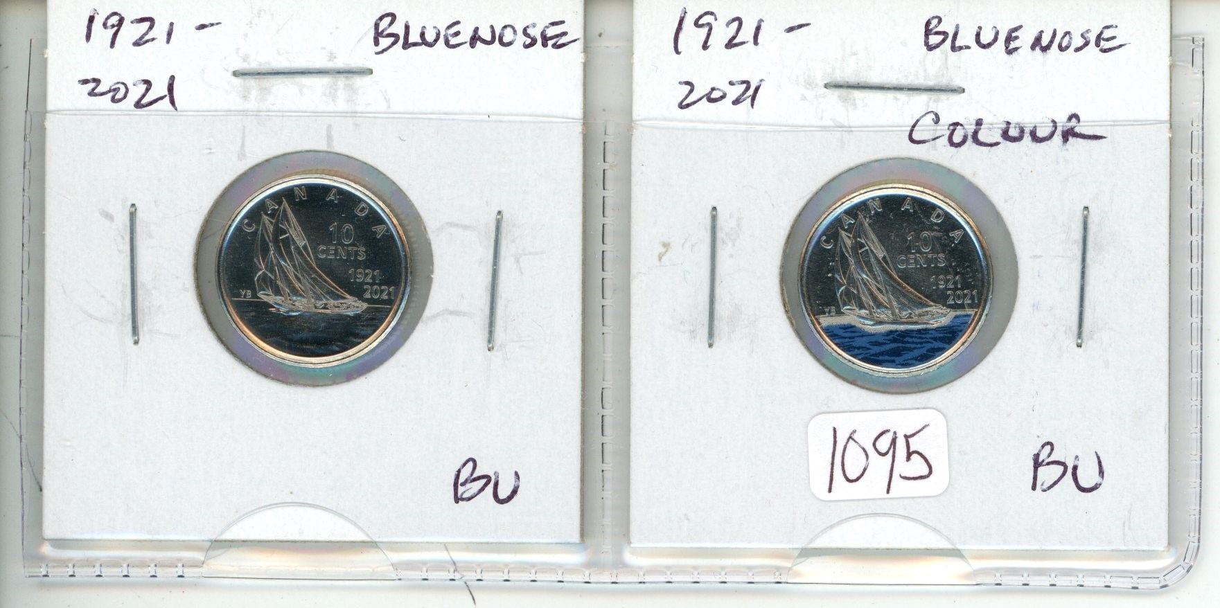 Complete set of 2 1921 – 2021 Bluenose 10 Cents. Includes Colourized & Regular. Brilliant Uncirculated from original rolls.