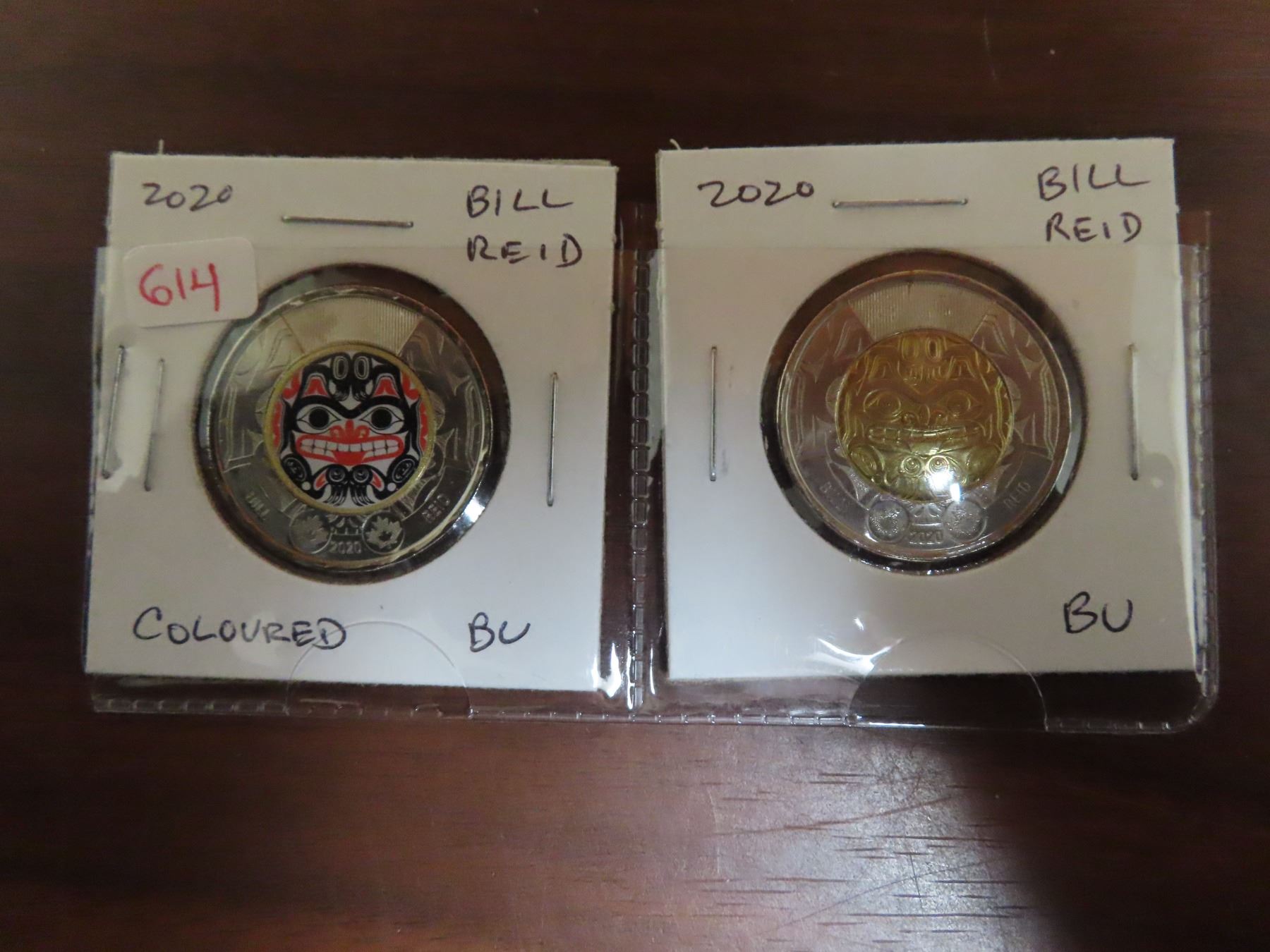 Complete set of 2 2020 Bill Reid Toonies. Includes Colourized & Regular. BU from an original Royal Canadian Mint roll.