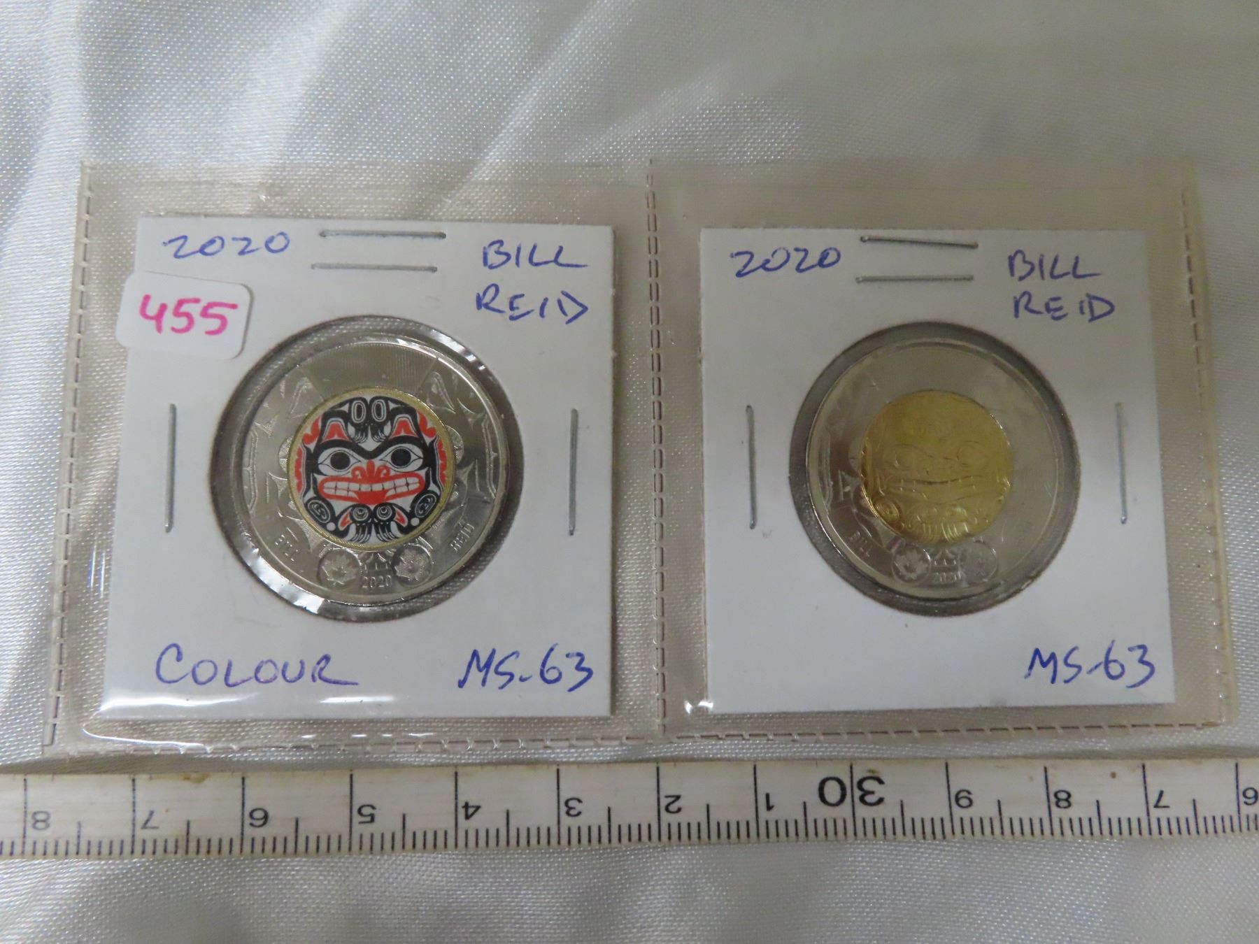 Complete set of 2 2020 Bill Reid Toonies. Includes Colourized & Regular. MS-63 from original rolls.