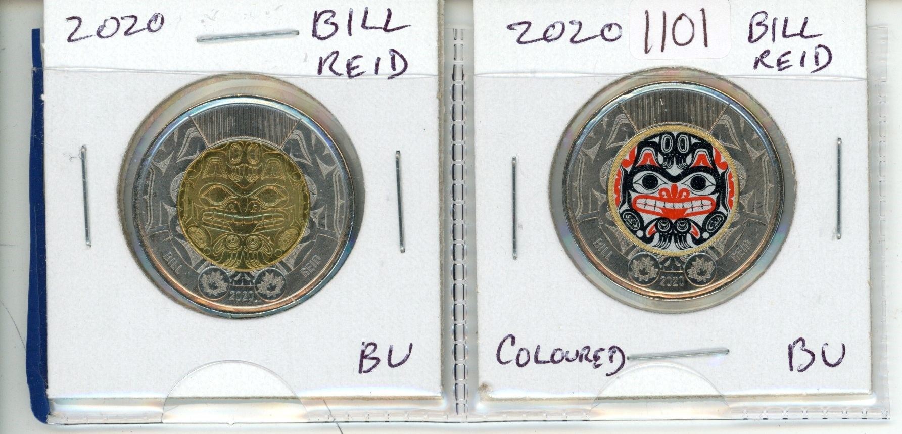 Complete set of 2 2020 Bill Reid Toonies. Includes Regular & Colourized. Brilliant Uncirculated form original rolls.