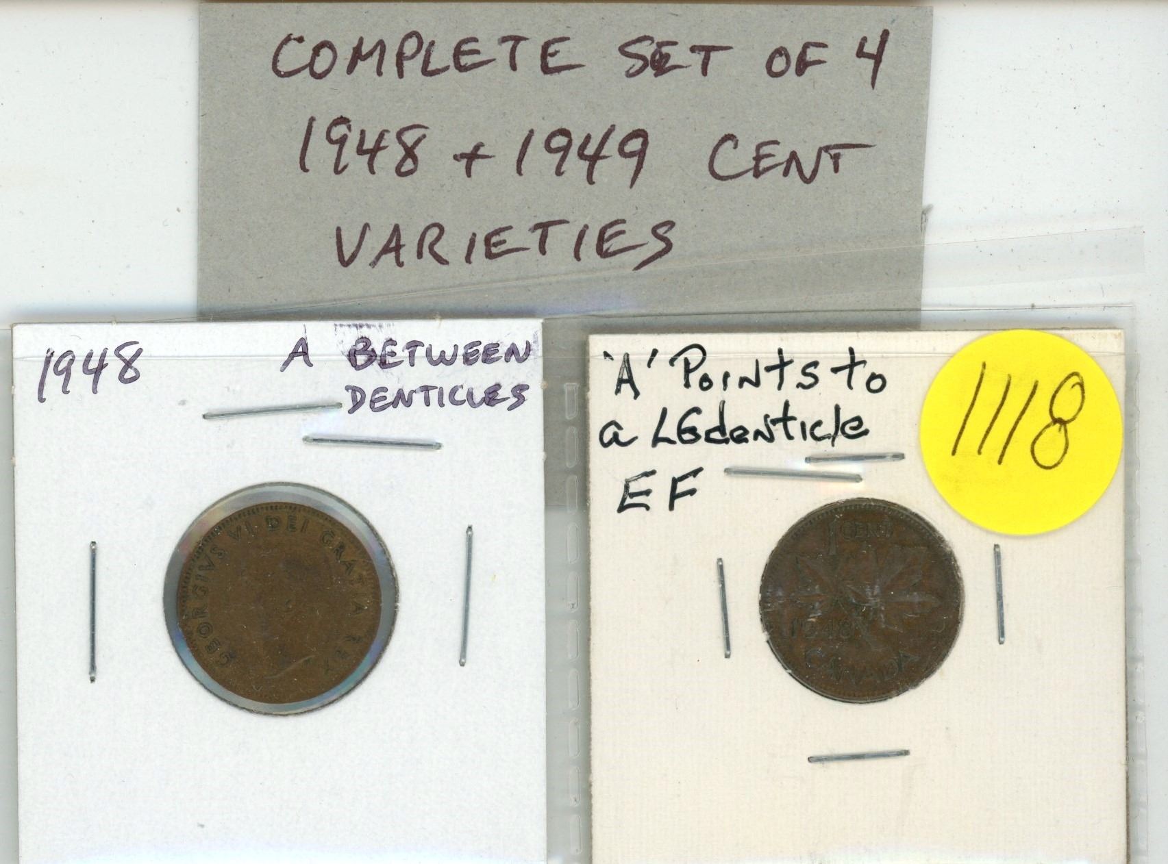 Complete set of 4 1948 & 1949 Small Cents. Includes both A Between Denticles and both Scarce A To Denticle. Coins grade VF-20.