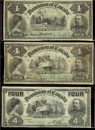 Complete set of $4 notes. Includes 1900 $4 DC-16 041400, 1902 $4 DC-17a 055479, DC-17b 439088. Grades vary from VG to Fine. Some writing on the notes.