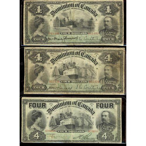 Complete set of $4 notes. Includes 1900 $4 DC-16 041400, 1902 $4 DC-17a 055479, DC-17b 439088. Grades vary from VG to Fine. Some writing on the notes.