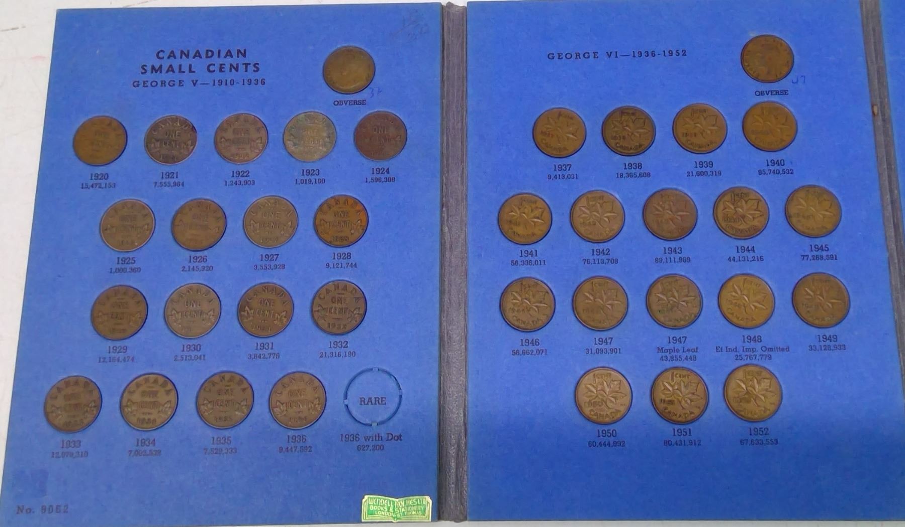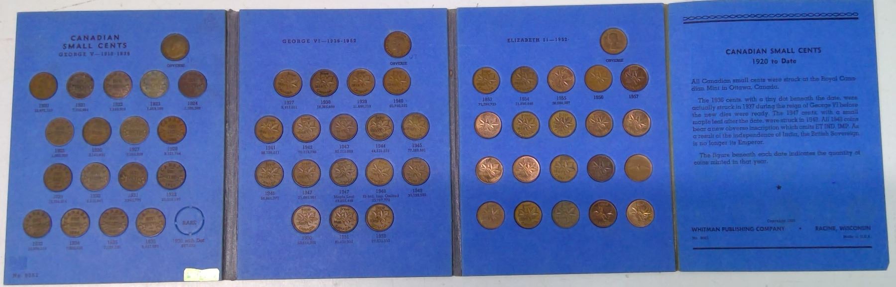 Complete set of Canadian Small Cents 1920 – 1976. Includes all the key dates including 1922, 1923, 1924, 1925 & 1926. Coins grade up to BU Red. Housed in a blue Whitman folder.