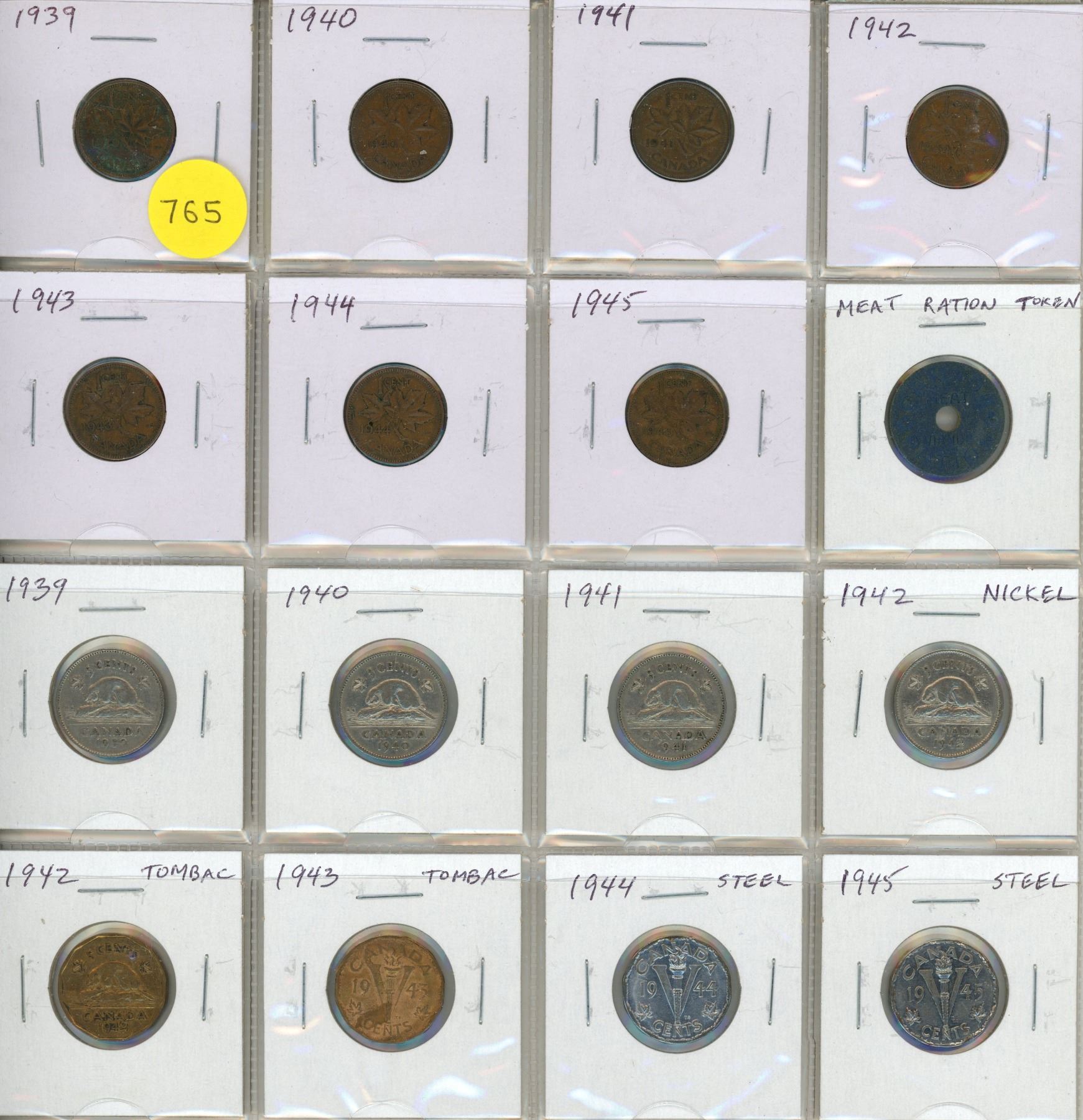 Complete set of Canadian World War II 1939 – 1945 Cents and 5 Cents, plus one Meat Ration Token.
