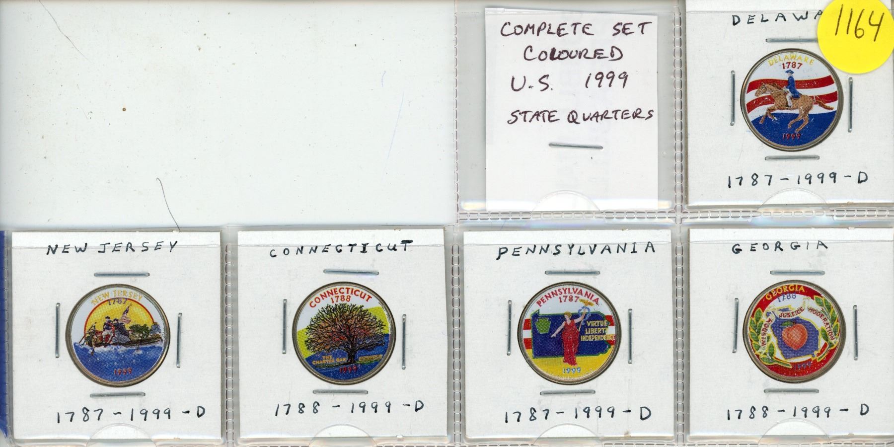 Complete set of Coloured U.S. 1999 State Quarters: Delaware, New Jersey, Connecticut, Pennsylvania & Georgia. All Denver Mint.