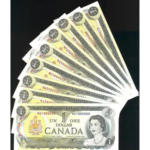 Complete set of Million numbered notes BC-46a 1973 $1 1000000, 2000000, 3000000, 4000000, 5000000, 6000000, 7000000, 8000000, 9000000. All notes are UNC to choice Unc.
