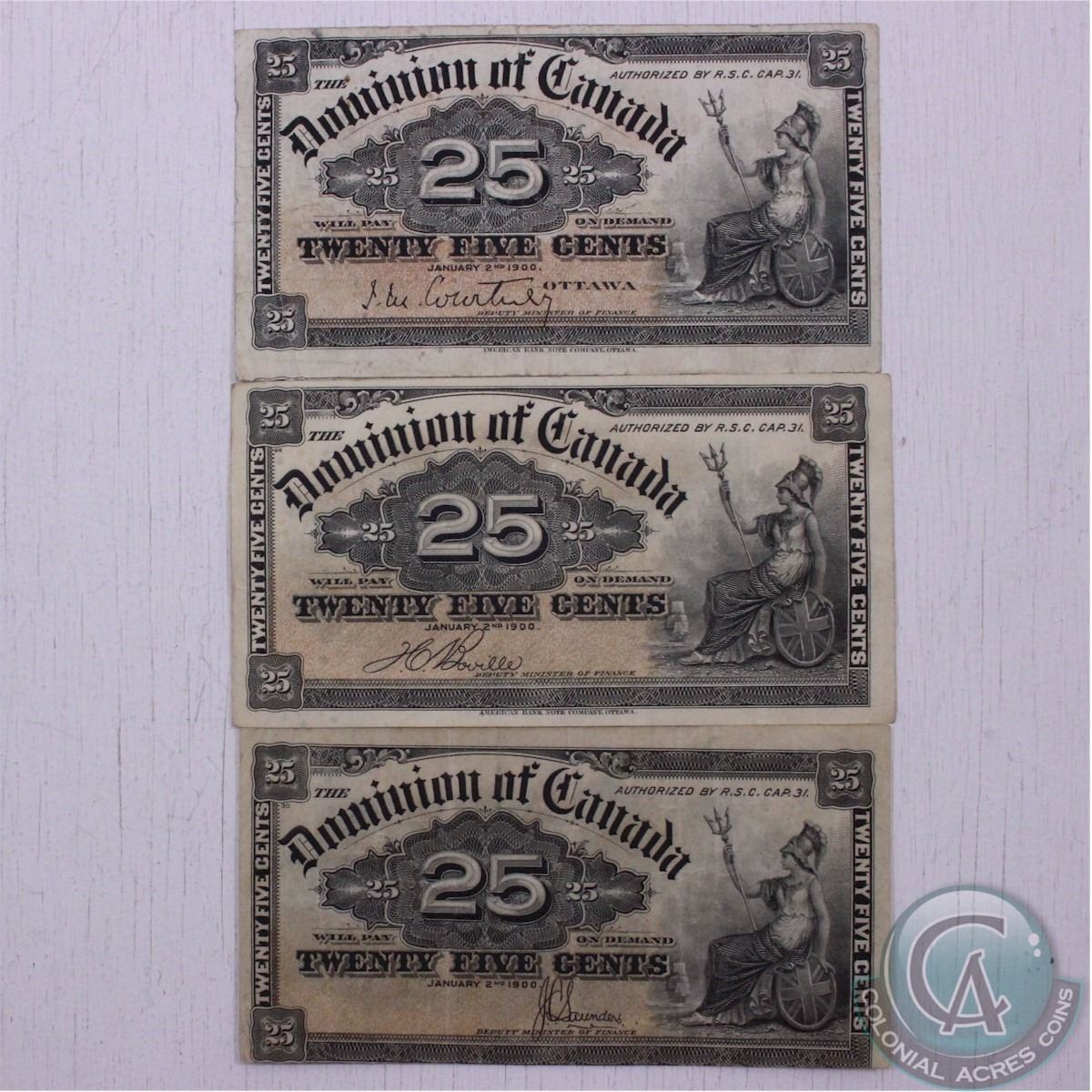 Complete signature type set of the 1900 25c issue. You will receive three 1900 25c notes; one of each signature available in the series. The notes are in fine or better condition and may contain holes