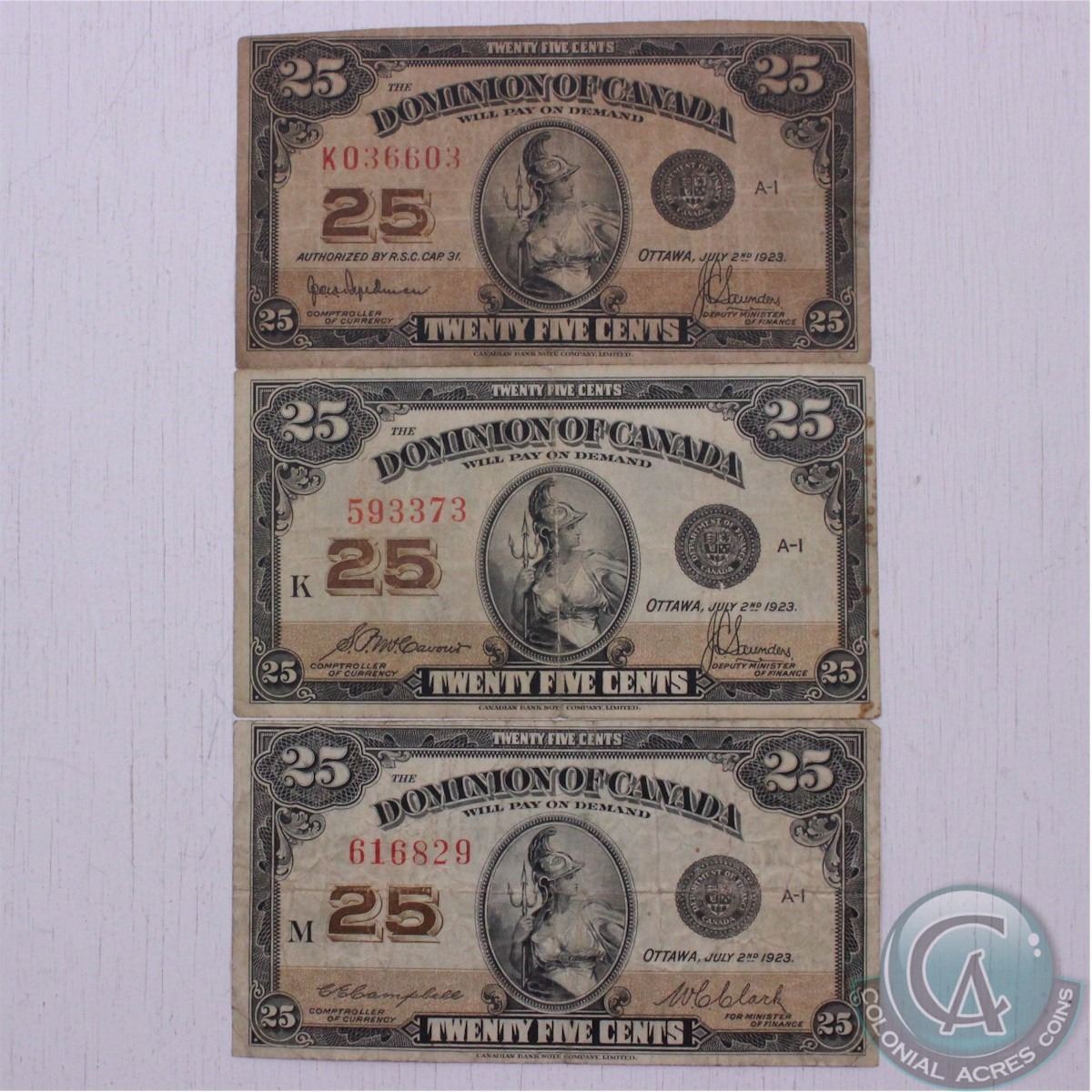 Complete signature type set of the 1923 25c issue. You will receive three 1923 25c notes; one of each signature combination available in the series. The notes are in fine condition and may contain holes or writing.