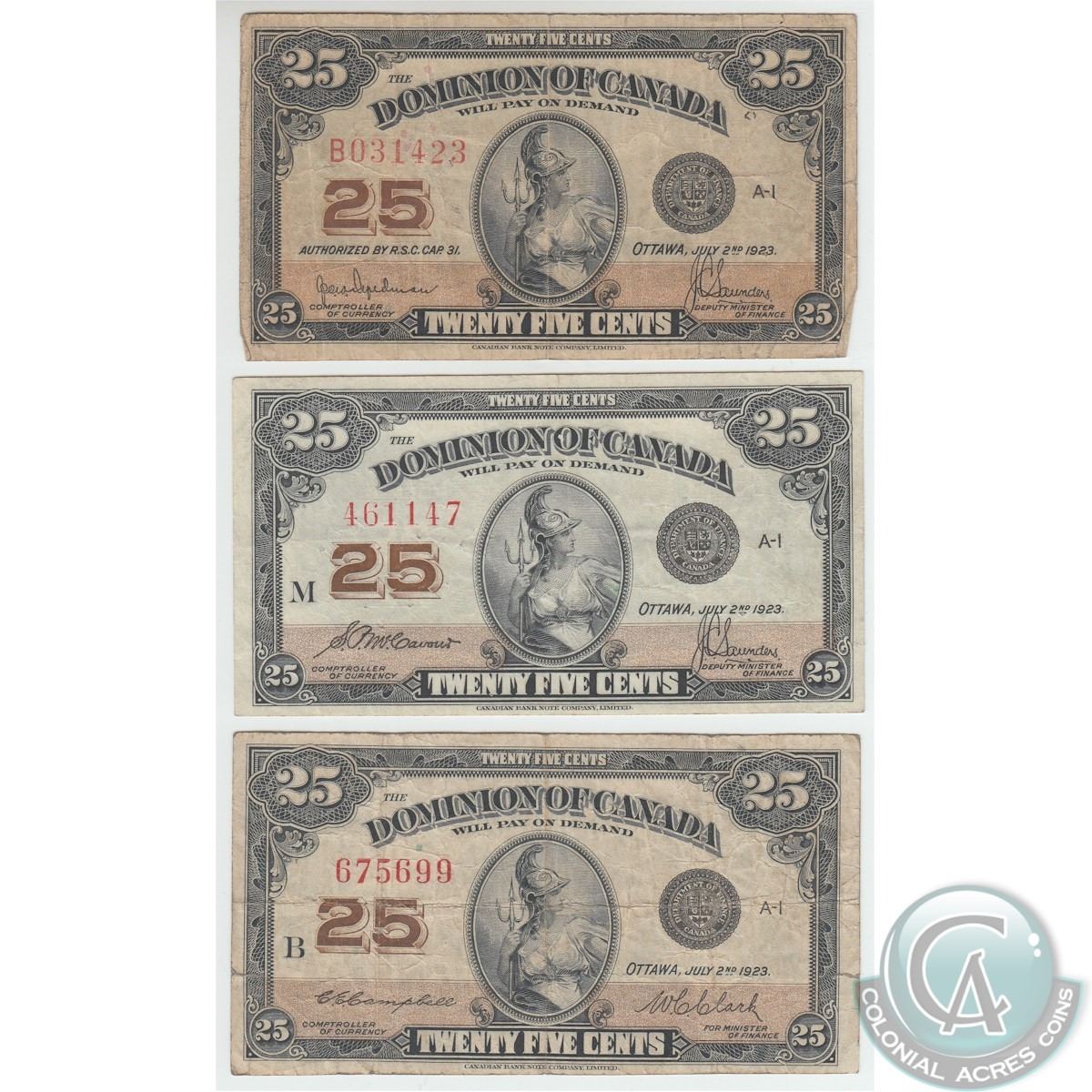Complete signature type set of the 1923 25ct. You will receive three 1923 25c notes; one of each signature combination available in the series. 3pcs