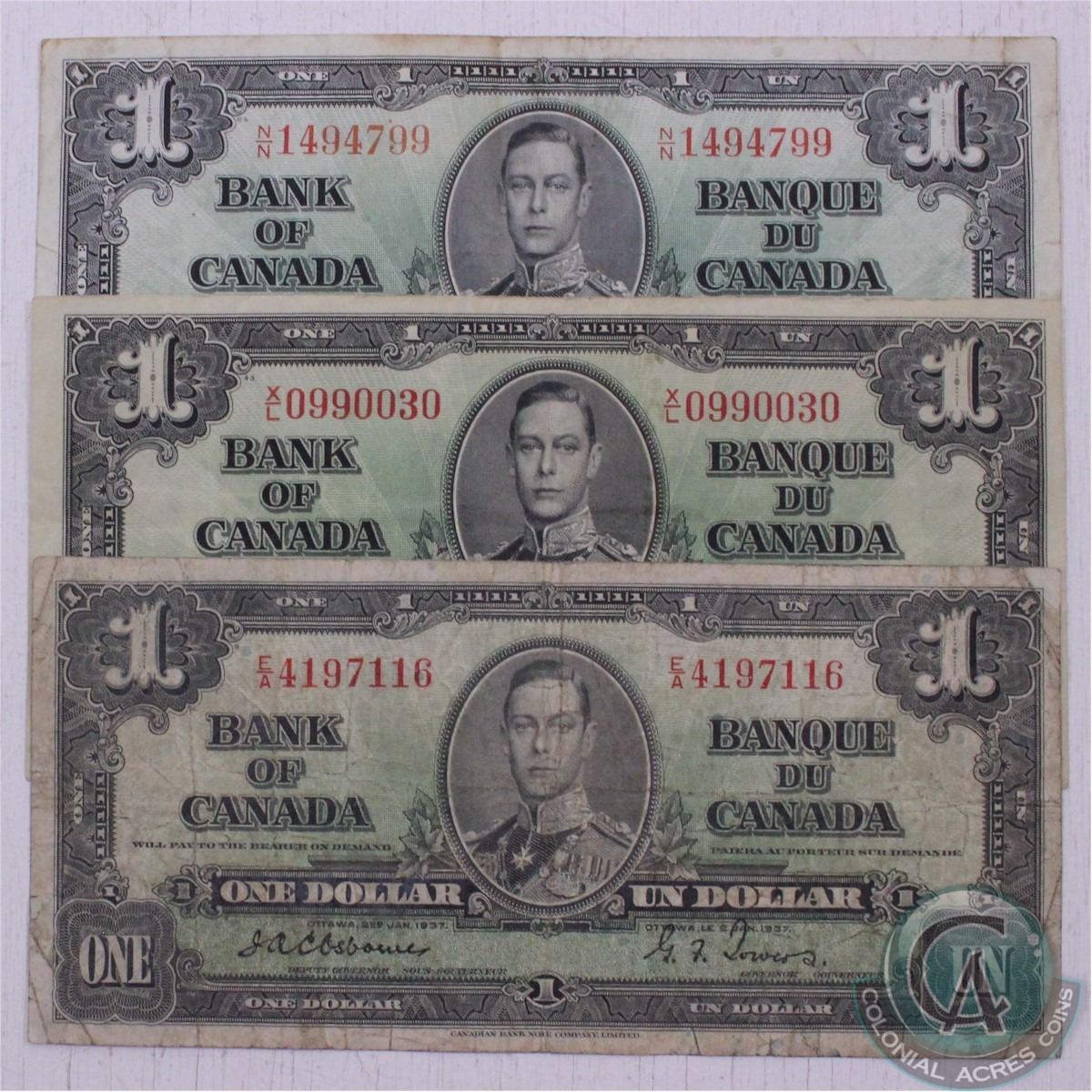 Complete signature type set of the 1937 $1.00 note. You will receive three 1937 $1.00 notes; one of each signature combination available in the series. The notes are in VG to VF condition and may contain holes, tears and/or graffiti
