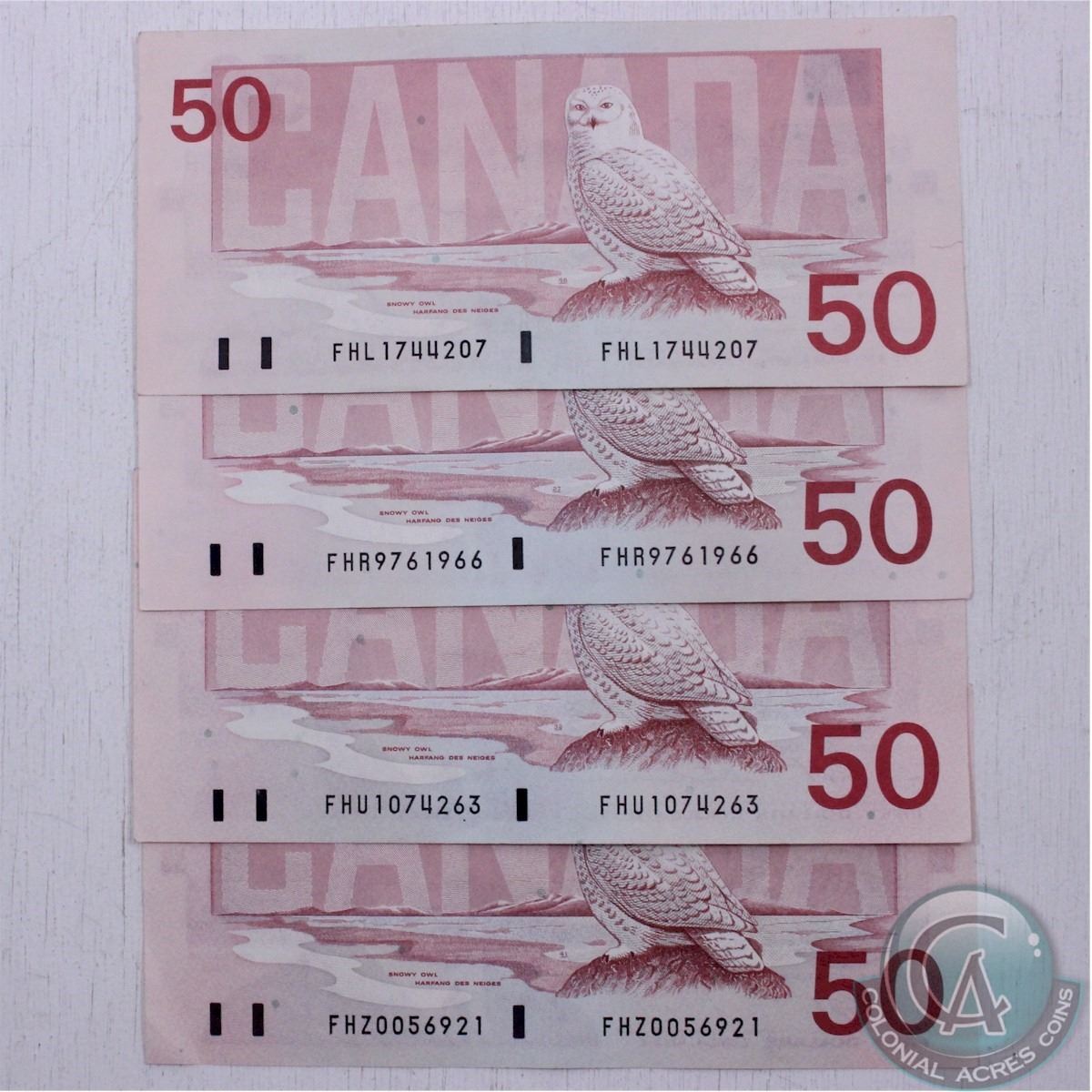 Complete signature type set of the 1988 bird series $50.00 note in average circulated condition. You will receive four bird series $50.00 notes; one of each signature combination available in the series.
