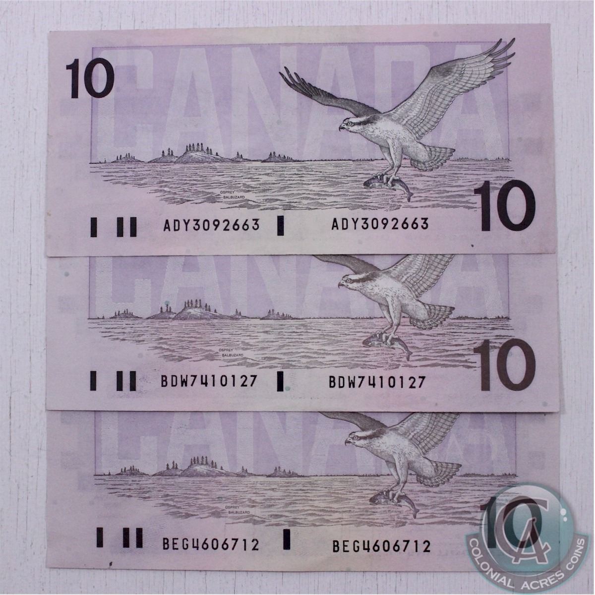 Complete signature type set of the 1989 $10.00 note. You will receive three 1989 $10.00 notes; one of each signature combination available in the series. The notes are in average circulated condition.
