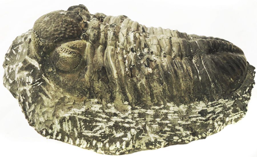 Complete trilobite fossil in matrix, from Morocco, approx. 250-500 million years old. 1106 grams, roughly 6-1/2" x 4-1/2" x 3". Typically dark-gray specimen with all details complete, including shell and eyes, laid out flat (not curved or balled up), and a decent size that is big enough to be impressive without taking up too much space.