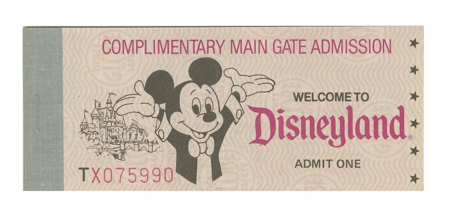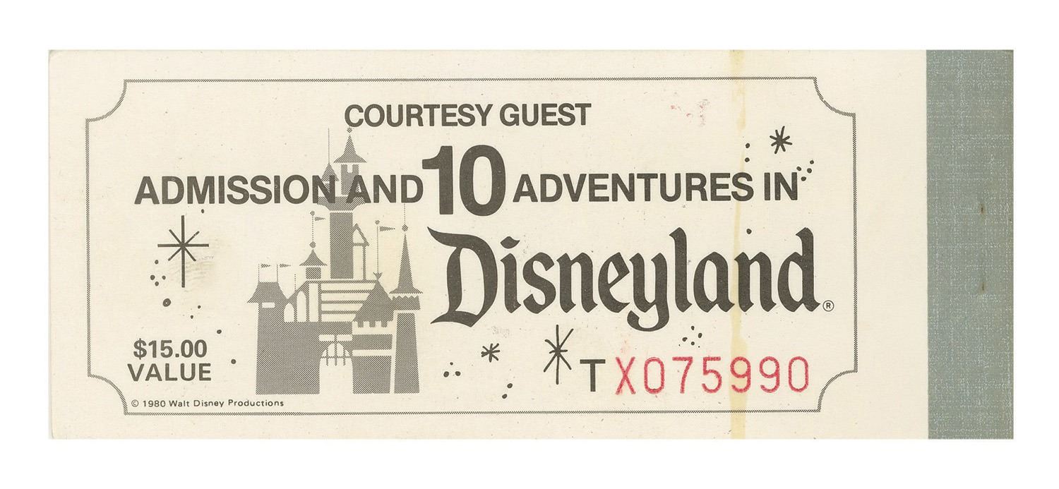 (Disneyland, 1980) A complimentary main gate admission ticket book that is still valid for park admission today. The book is complete, with all of its (10) coupons and front admission stub still intact. Measuring 2"x5", the ticket book is in very good condition with minor discoloration to the reverse.