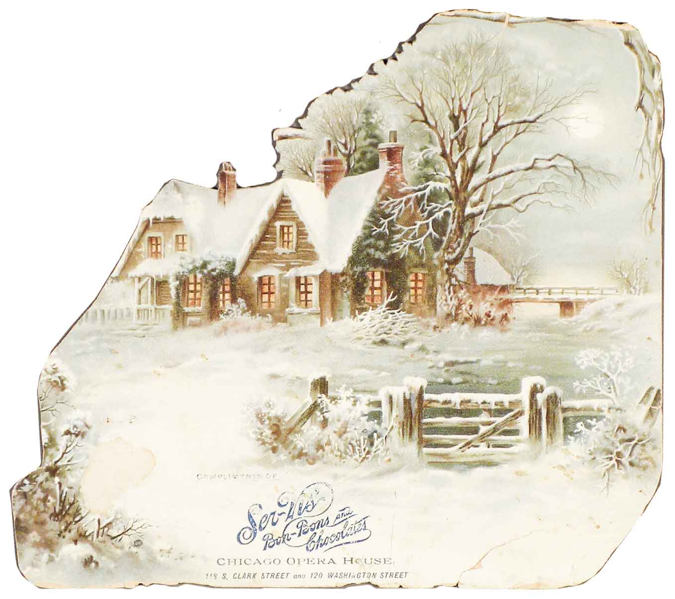 Die Cut Cardboard Sign Compliments of Ser-Vis' Bon-Bons and Chocolates, Chicago Opera House. Winter scene with glitter glaze. Framed under glass. Tear at 5:00 and paper loss at 7:00 and along right top and bottom edge otherwise good condition. 9 X 8 inches image only.