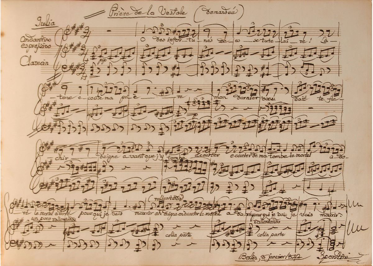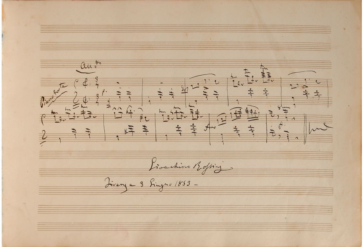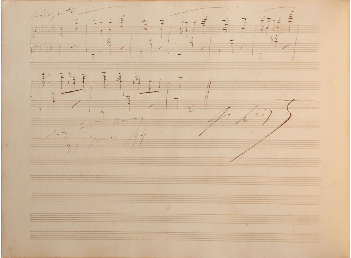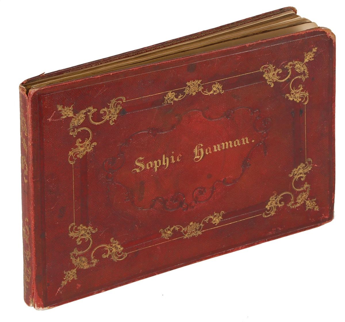 Impressive red leather-bound autograph book owned by Sophie Hauman[n] (born Kann, 1815), sister-in-law of the famous violinist Theodor Haumann (1808–1878), 12 x 8.75, signed by various friends and people of note during the mid-1800s. Highlights of the book are three lengthy AMQSs by the great composers Franz Liszt, Gioachino Rossini, and Gaspare Spontini. The Liszt is signed “F. Liszt,” June 21, 1844, and consists of nine bars of waltz-like music on a grand staff in 3/4 time. The Rossini is signed “Gioachino Rossini,” July 3, 1853, and similarly consists of ten bars of waltz-like music on a grand staff in 3/4 time. The Spontini is signed “Spontini,” January 8, 1842, and consists of twenty-five bars of the music and lyrics to “Priere de la Vestalle,” from his tragic opera La Vestale [The Vestal Virgin]. Other signers in the album include (some items affixed inside): Tsarina Alexandra Feodorovna (ALS), Joseph Schad (AMQS), Henri Herz (ALS), Charles Gounod (ANS), painter Jean-Baptiste Madou (two ALSs), writer Frederic Soulie (two-page autograph poem), and various others. In very good to fine condition, with heavy wear to the covers; lighter wear and soiling to interior pages, most of which have separated from the binding (the three most significant pages are clean and fine). A remarkable compilation boasting large, bold musical quotations from Europe’s foremost composers.