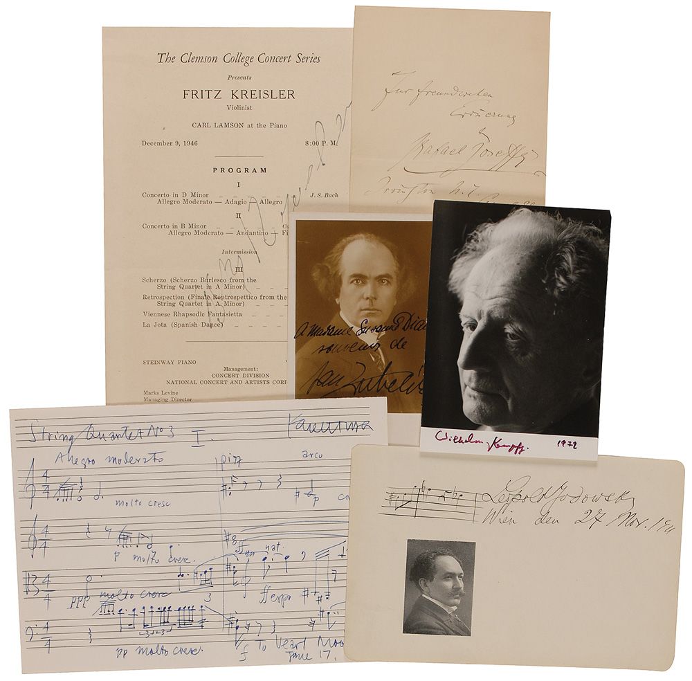 Six items: one vintage 3.5 x 5.5 postcard photo of Jan Kubelik, inscribed in an unknown hand and signed in fountain pen, and dated May 23, 1931; one two-bar AMQS on a 7.5 x 5 off-white album page with an affixed program photo, signed “Leopold Godowsky,” and dated Vienna, November 27, 1911; one eight-bar AMQS from ‘String Quartet No. 3’ on a 8.5 x 6 off-white musically-lined sheet, signed in the upper right, “Karel Husa”; one black ink signature and inscription, “Rafael Joseffy,” on an off-white 4.5 x 7 sheet, dated April 1889; one program page for a performance by Fritz Kreisler at Clemson on December 9, 1946, 6 x 9.75, signed in black ink by Kreisler; and one 4 x 5.5 postcard photo of Wilhelm Kempff, signed in the lower border in black felt tip and dated 1972. In overall fine condition, with central vertical and horizontal folds to the Kreisler page that pass through the signature.