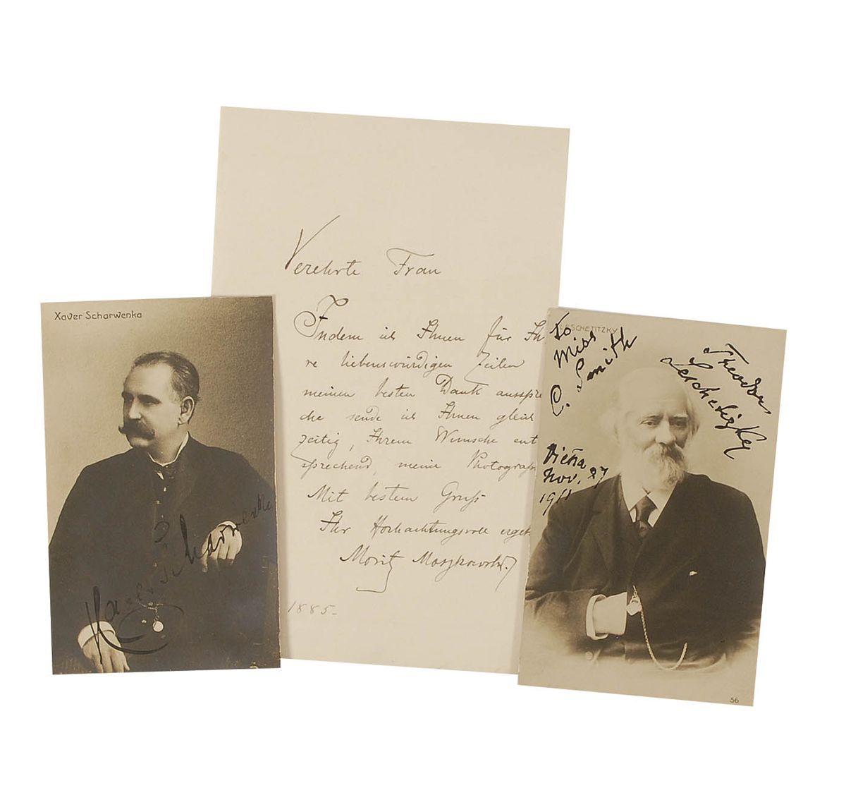 Three items: vintage 3.25 x 5.25 postcard photo of Xaver Scharwenka, signed in fountain pen; vintage 3.25 x 5.25 postcard photo of Theodor Leschetizky, signed and inscribed in fountain pen; and an untranslated ALS, in German, signed “Moritz Moszkowski,” one page, 4.75 x 7.75, dated June 1885. In fine condition, with some light silvering to darker areas of photos.
