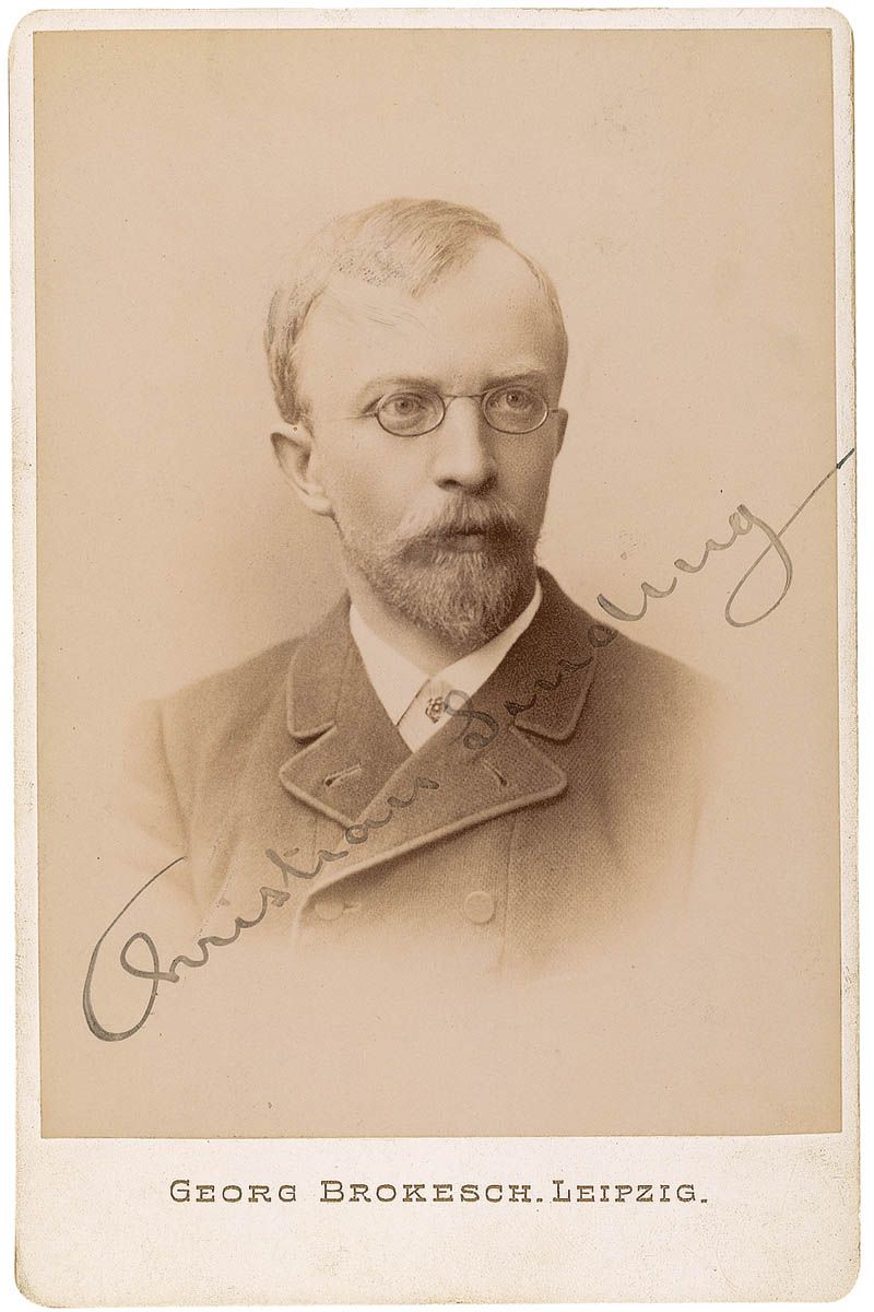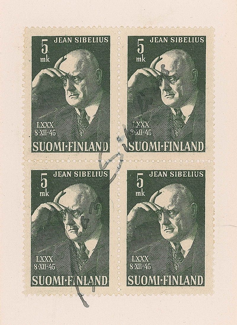 Two items: rare original 4.25 x 6.5 cabinet photo of Christian Sinding, by George Brokesch of Leipzig, signed across the image in black ink; and a block of four Finnish postage stamps honoring Jean Sibelius, signed in black ink. Moderate contrast to Sibelius’s signature, otherwise fine condition.
