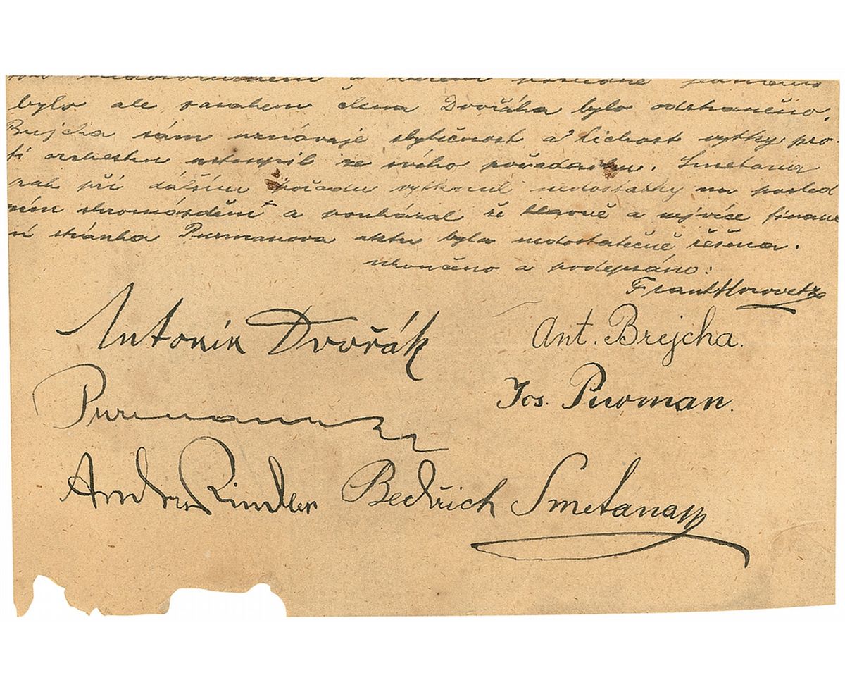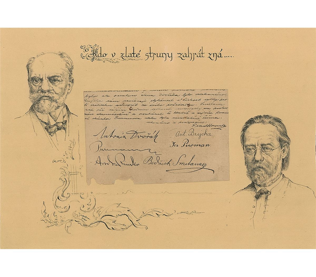 Untranslated manuscript DS, one page, 6 x 4, a conclusion of a protocol about a debate signed at the conclusion by Bedrich Smetana and Antonin Dvorak as well as other musicians including Anton Brejcha, Purmann, Andrej Rindler, and one other. Document is affixed by its top edge to a 13.75 x 9.75 off-white board with two drawings by J. Kadlec, dated 1950, one of Dvorak, and one of Smetana. Several light horizontal folds affecting small portions of signatures, uniform toning, and paper loss along bottom edge, otherwise fine condition.