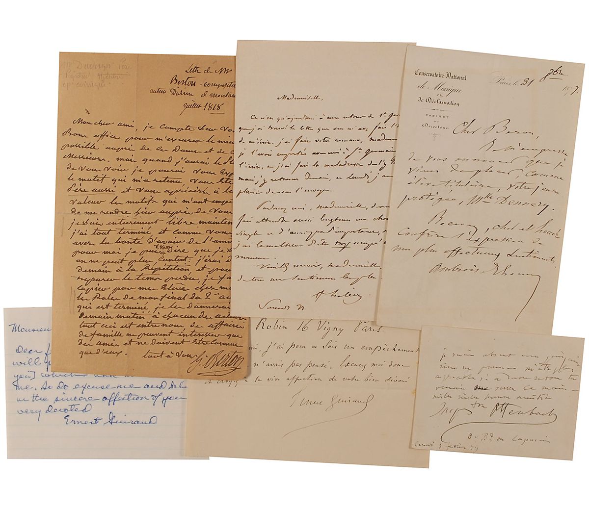 Five untranslated ALSs, various lengths and languages. Letters are from: Henri Berton, July 1881, writing that he has finished his opera and is planning rehearsals; Ernest Guiraud; Jacques Fromental Halevy; Jacques Offenbach, February 3, 1879, in part; “I am leaving soon for Vienna…but don’t want to leave Paris without telling you how much pleasure your little note gave me”; and Ambroise Thomas, October 31, 1877, in part: “I hasten to inform you that I have just officially enrolled your young protegée Miss Dennery as a full time student.” In overall very good condition.