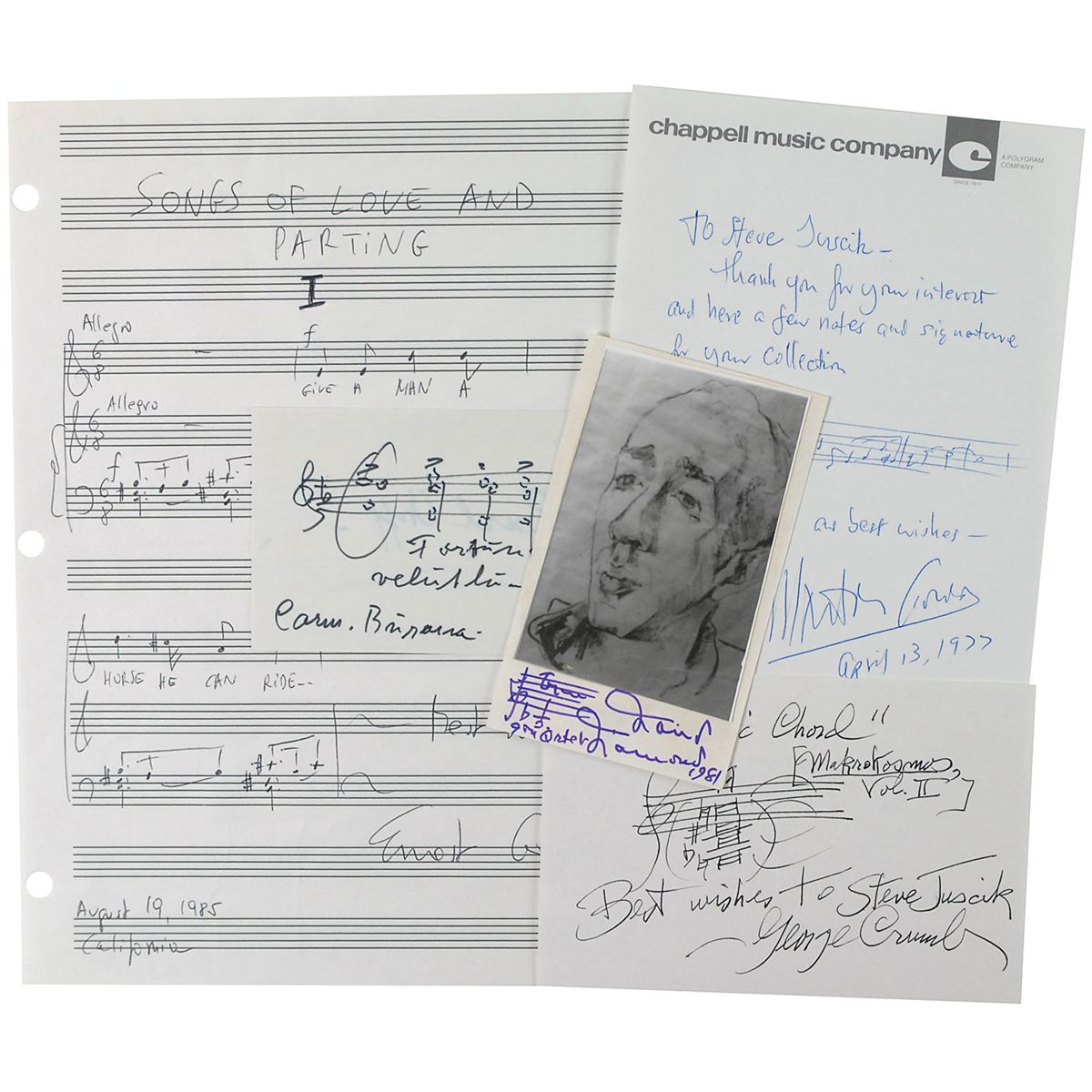 Collection of five AMQSs on various size sheets, cards, and postcards, each signed by the song’s composer. Signers are: George Crumb (‘Makrokosmos’), David Diamond (‘9th Quartet’), Ernest Gold (‘Songs of Love and Parting’), Morton Gould (‘Pavane’), and Carl Orff (‘Carmina Burana’). In overall fine condition.