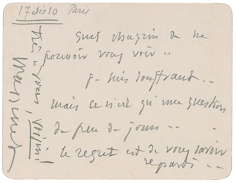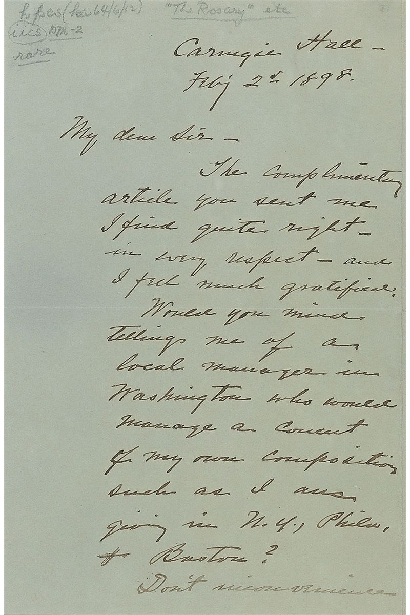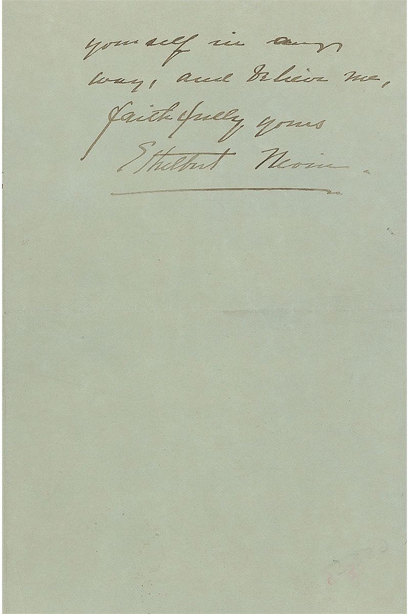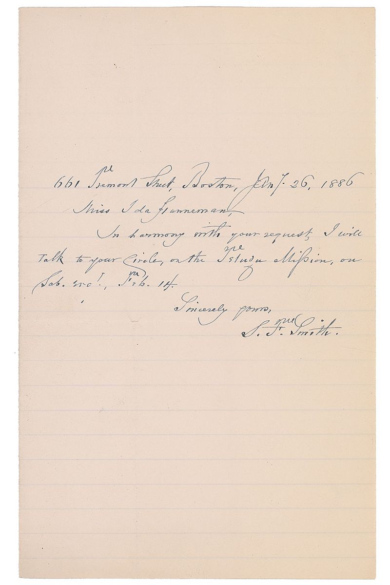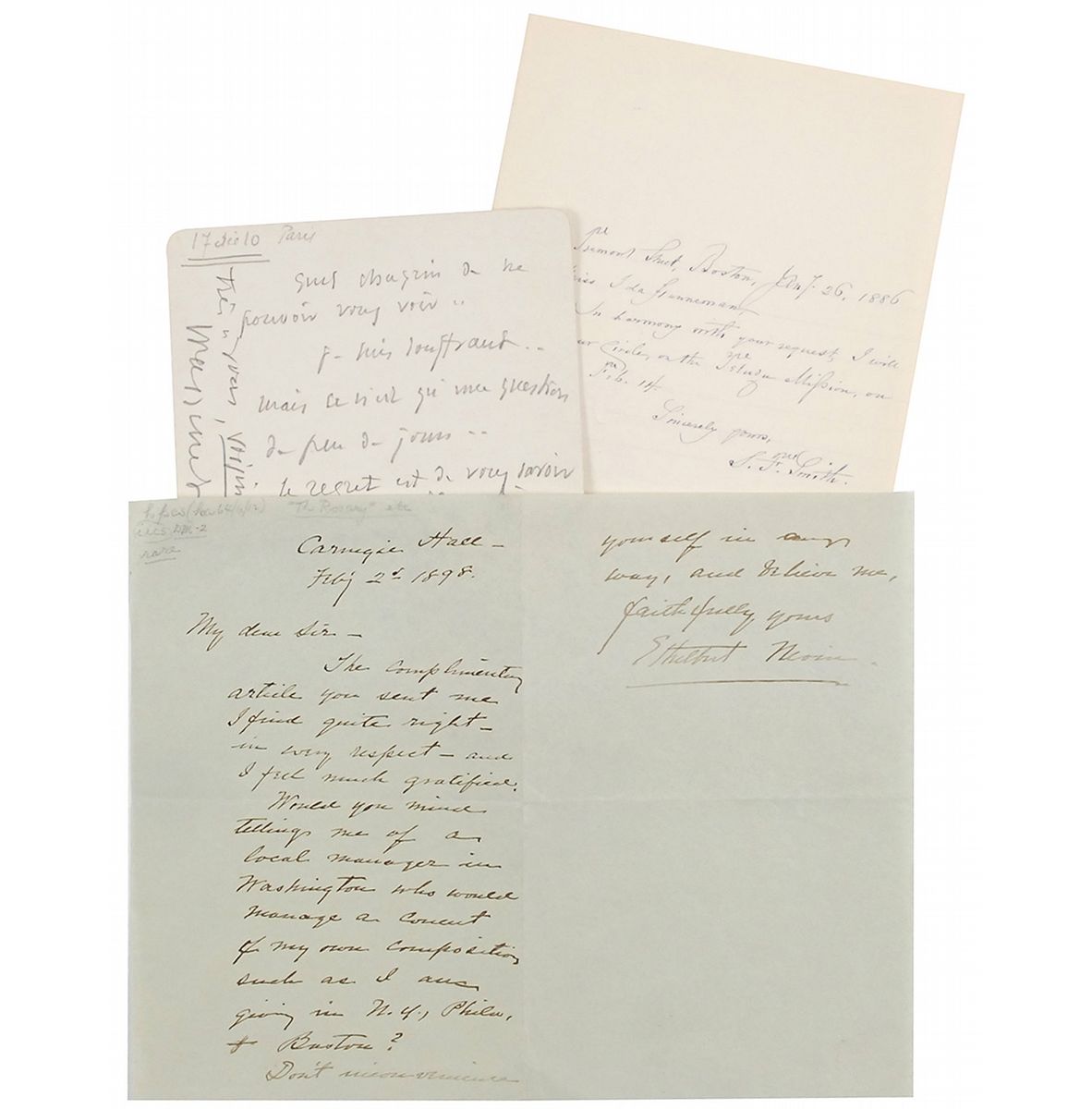 Letters from Jules Massenet, Ethelbert Nevin, and Samuel Francis Smith: ANS in pencil, signed “Massenet,” one page on an off-white card, December 10, 1910, sending regrets; ALS signed “Ethelbert Nevin,” two pages on two adjoining sheets, February 2, 1898, requesting the name of someone “who would manage a concert of my own compositions”; and an ALS signed “S. F. Smith,” one page, January 26, 1886, accepting an invitation. In overall fine condition.