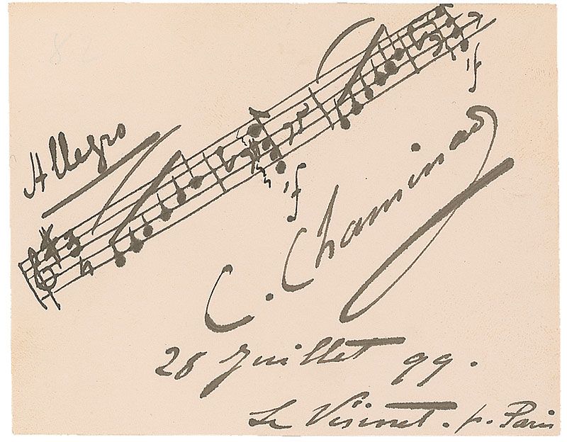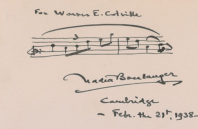 Two AMQSs on individual off-white cards, measuring approximately 4 x 3. One from Nadia Boulanger, who pens two bars from an unidentified work, signed and inscribed, “For Warren E. Colville, Nadia Boulanger, Cambridge, Feb. The 21st, 1938”; and a four-bar quote from an unidentified work by Cecile Chaminade, signed “C. Chaminade, 28 Juillet 99, St. Vincent, Paris.” In fine condition.