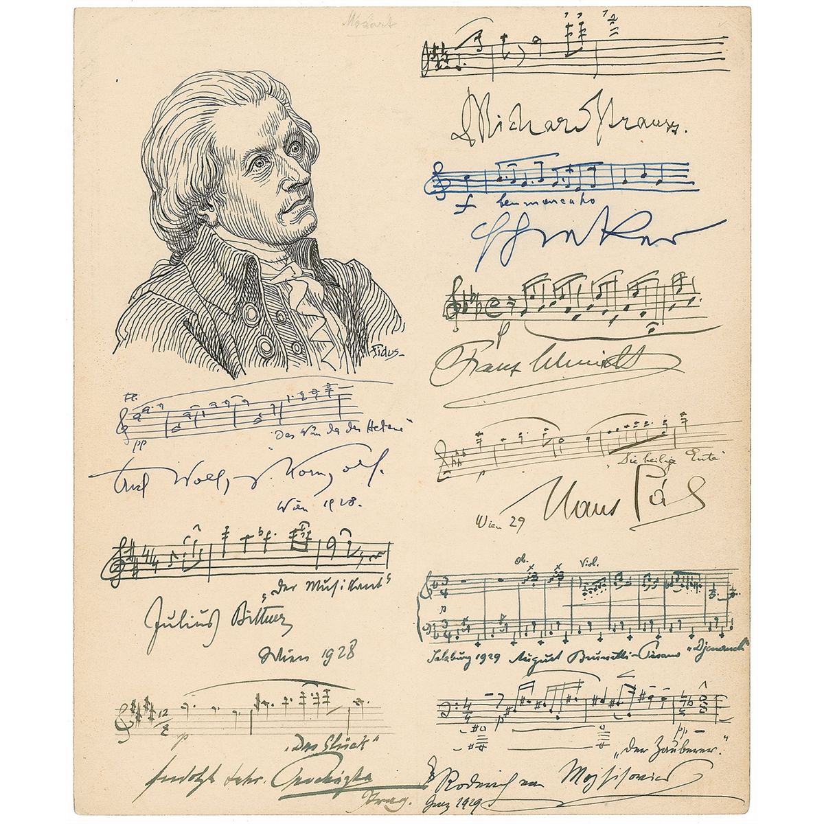 An outstanding collection of nine AMQSs on a single 7.75 x 9.25 off-white sheet, with each composer penning at least three intricate bars of music and signing below. Signers are: Richard Strauss, Franz Schreker, Franz Schmidt, Hans Gal, August Brunetti-Pisano, Roderich von Mojsiewicz, Erich Wolfgang Korngold, Julius Bittner, and Rudolf Freiherr von Prochazka. Each has added a notation to the quote, most likely the title of the work, with a couple adding other applicable notations. The sheet also bears a small printed image of a sketch of Mozart by Fidus in the top left corner. In fine condition. A unique and tremendously appealing classical music piece.