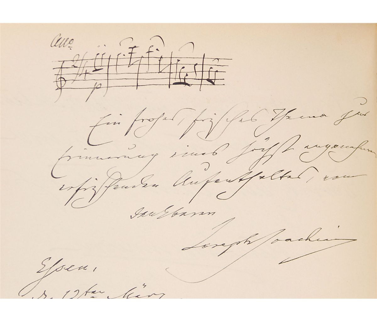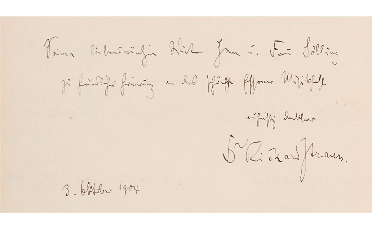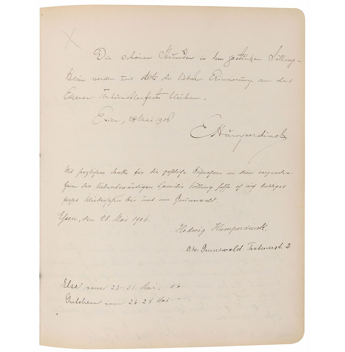 An exceptional leatherbound guest book, 7.5 x 9.25, compiled between 1900 and 1930, signed inside by a multitude of figures including over thirty composers, opera singers, and a couple artists, many adding lengthy inscriptions and AMQSs, including: Engelbert Humperdinck, Hedwig Humperdinck, Richard Strauss, Pauline de Ahna, Max von Schillings, Bodo Wolf, Georg Heinrich Witte, Richard Stronck, Anna Stronck-Kappel, Julius Buth, Clotilde Kleeberg, Artur Schnabel, Joseph Joachim, Hermann Behr, Emanuel Wirth, Elsa Ruegger, Ernst Cahnbley, Guilhermina Suggia, Ludwig Hess, Anton Sistermans, Sophie Rohrbrajnin, Pauline de Haan-Manifarges, Maria Philippi, Rose Ettinger, Ottilie Metzger, Tilly Cahnbley-Hinken, Louise Hovelmann-Tornauer, the Gewandhaus Quartet, Hans Von Volkmann, Otto Marcus, and Georg Wegener. Also includes a cabinet photo signed on the reverse by Georg Heinrich Witte, a program signed by Kuno Stierlin, and a few unsigned programs and photos. In fine condition, with light toning to interior pages and scattered marks, dings, and wear to covers.