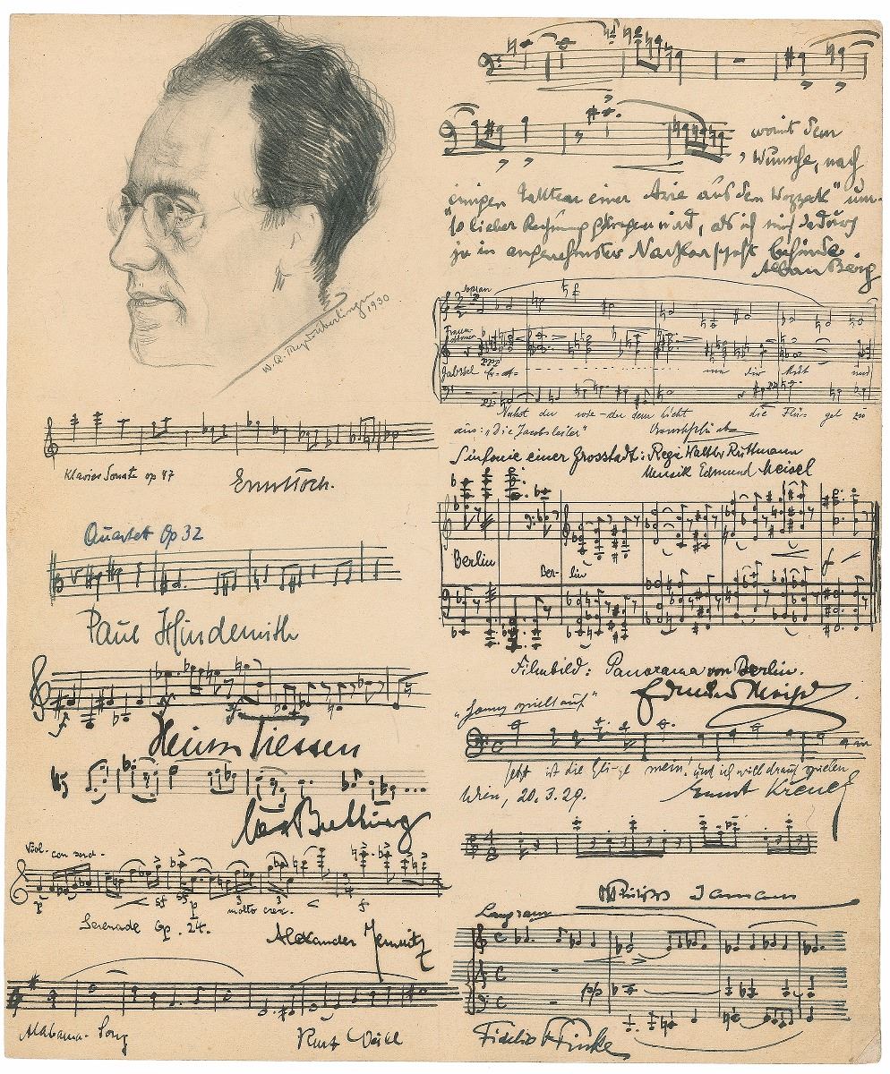 Exceptional group of vintage AMQSs on a single off-white 7.75 x 9.25 sheet, with each composer penning a few bars of his music and signing below. Signers are: Ernst Toch, Paul Hindemith, Heinz Tiessen, Max Butting, Alexander Jemnitz, Kurt Weill, Alban Berg, Arnold Schoenberg, Edmund Meisel, Ernst Krenek, Philipp Jarnach, and Fidelio Finke. An impeccable pencil portrait of Gustav Mahler has also been drawn at the top by an unknown artist. In fine condition.