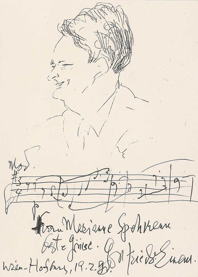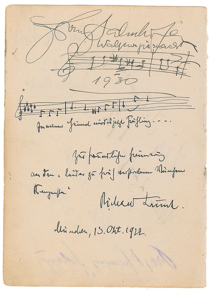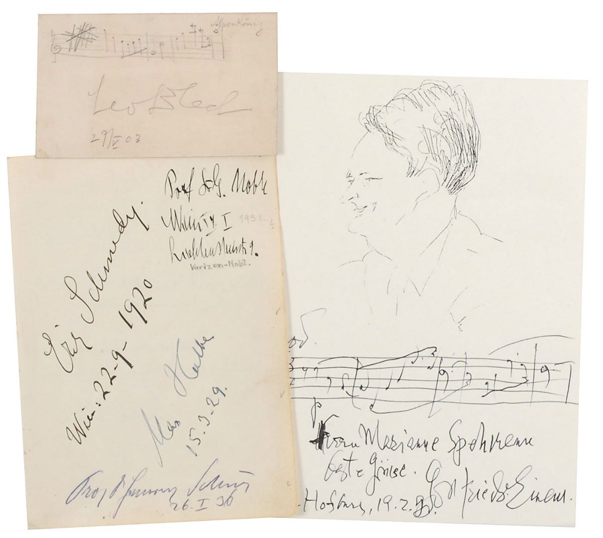 Collection of four musical quotes on various size sheets and cards. Quotes are from: Leo Blech, four bars, in pencil, from his opera 'Alpenkonig'; Gottfried von Einem, five bars of an unidentified work, signed and inscribed at the bottom and bearing a pre-printed portrait; Richard Trunk, four bars of music and lyrics from his famous song 'In Meiner Heimat wird es jetzt Fruhling'; and Franz Salmhofer, two bars from his 'Walpurgisnacht.' Reverse of Trunk's page is signed by Max Halbe and three others. In overall very good condition.