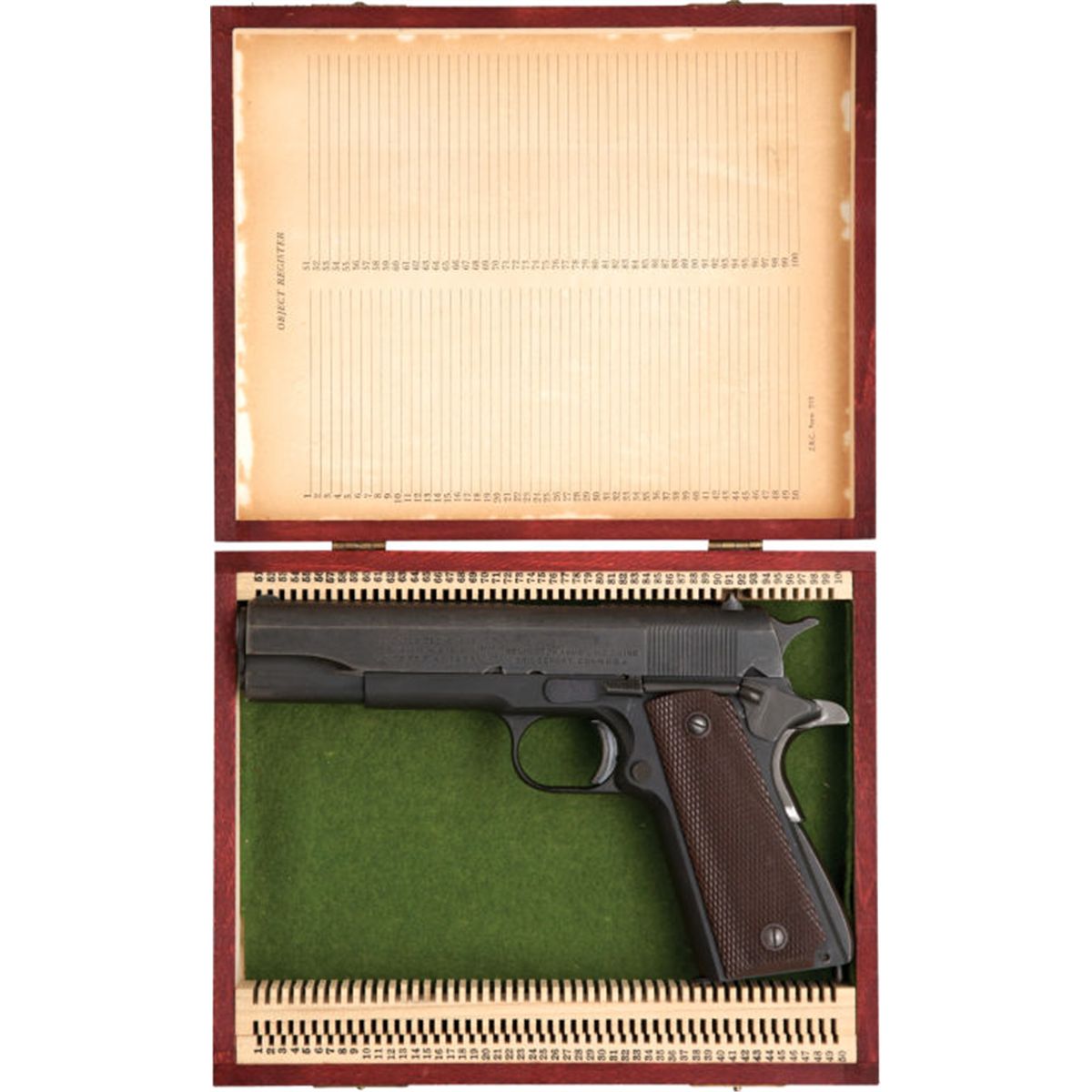 *Composite Custom U.S. Model Remington UMC 1911-A1 Semi-Automatic Pistol Serial no. JDB001, .45 ACP caliber, 5-inch barrel. Remington-UMC marked slide. Parkerized finish. Checkered brown plastic grips. Lanyard loop. Contained in associated wooden case. Condition: Good as refinished and reconfigured. Retaining approximately 90-95% reparkerized finish with scattered wear to relief edges. Grips very good. Action good.