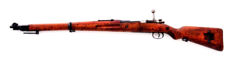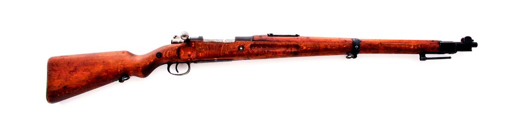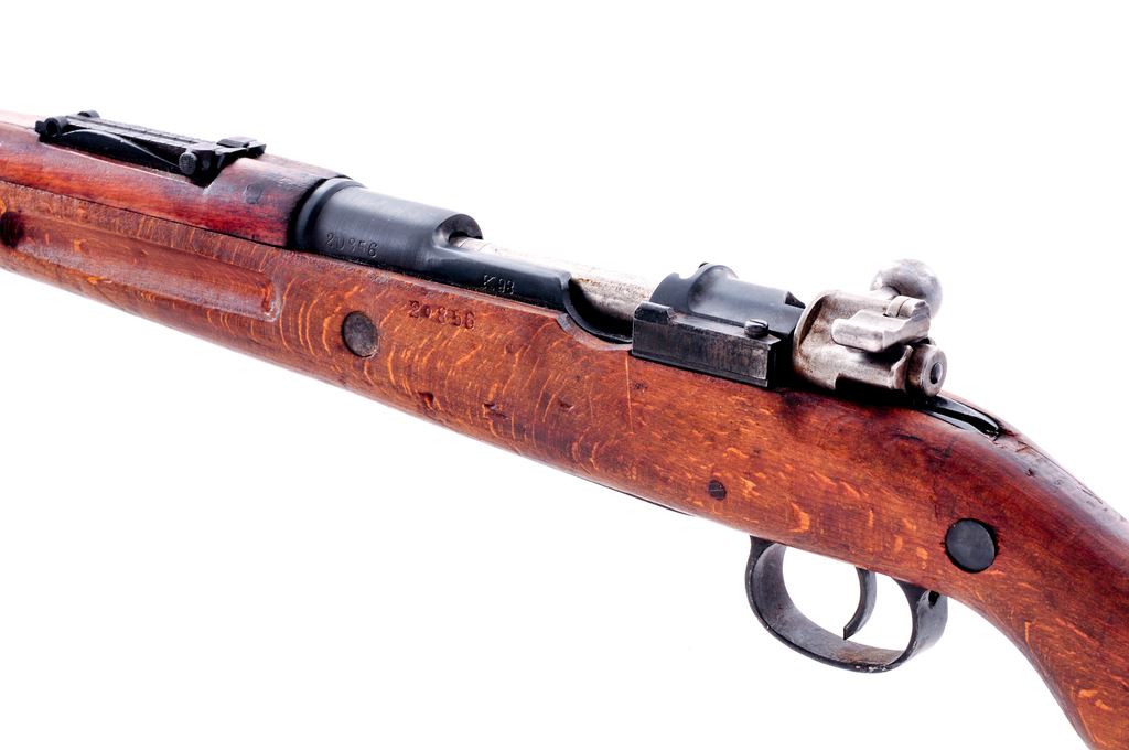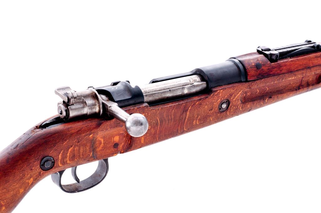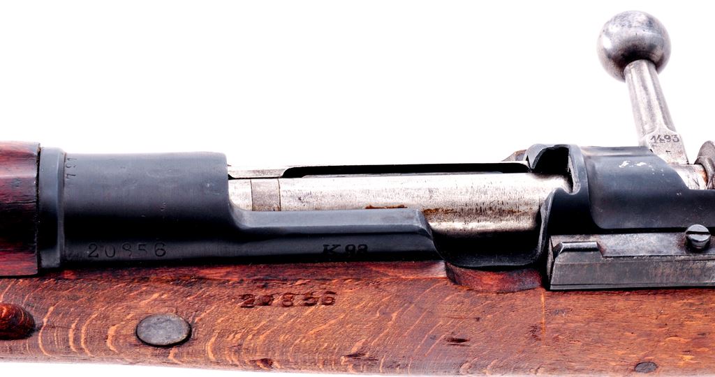 Composite German Model 98a style Mauser Bolt Action Rifle, #20856, 8x57mm cal., 23.6'' barrel, blued finish, hardwood stock, inverted ''V'' front sight with protectors and adjustable tangent rear sight. Markings have been removed from receiver and ''K98'' has been added to the left side receiver rail. Matching numbers have been added to the left side of stock, other numbers are mismatched. Rifle has been built using a Model 98a front band assembly and lower band. Bolt handle is straight and does not turn down. Condition overall is very good with over 90% of the reblued finish remaining on the metal with scattered rust spots. Stock has a crack at the wrist which appears to have been repaired by the installation of an additional recoil lug. An ''A'' has been carved into the left side of the buttstock and the handguard is cracked at the rear sight. Overall the wood shows light scratches and mars. Action is smooth, bore is bright with good rifling. Import stamped on left side of barrel. Est.: $300-$450. (C&R)