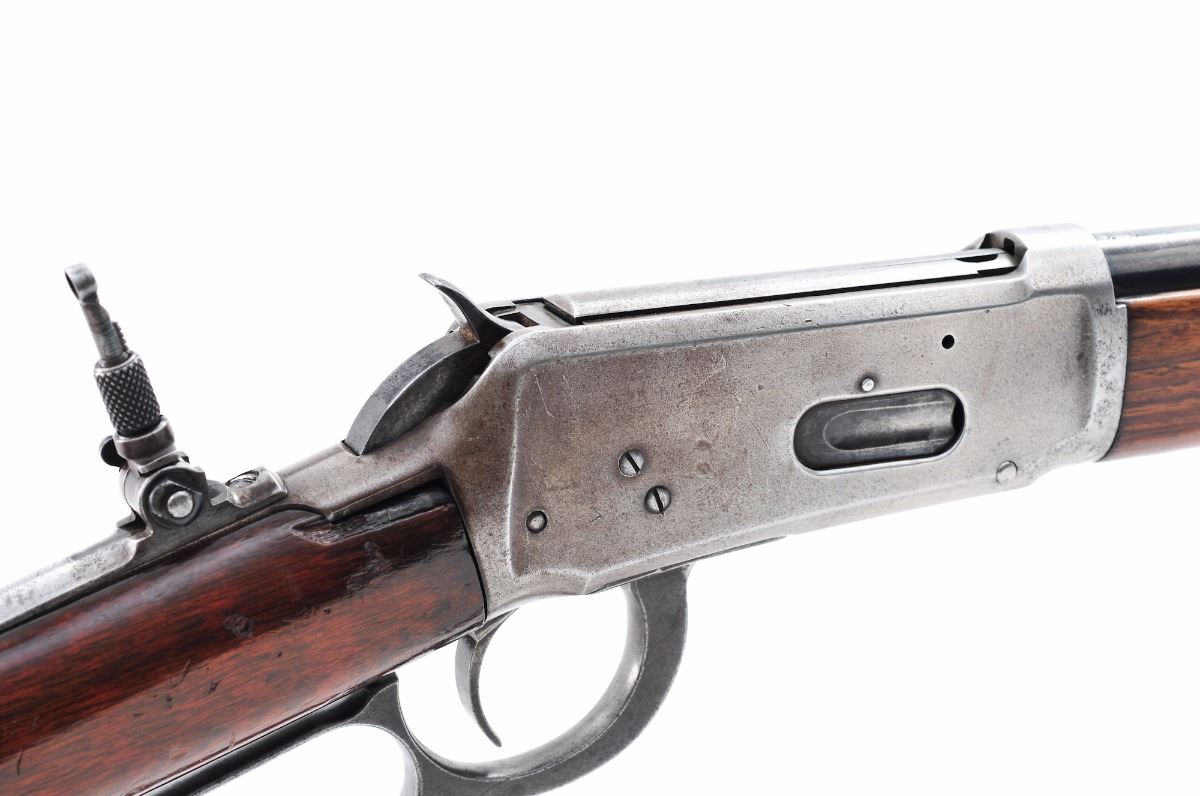 Composite Winchester Model 1894 Receiver with a Model 55 Barrel, #560337, .30-30 cal., 24'' tapered round barrel, half mag, blue finish, straight walnut stock with shotgun type butt, Marbles tang sight, ramp brass bead front sight, and semi-buckhorn rear sight. Condition is fair. Barrel and mag assembly retain approx. 65%-70% thinning blue; frame shows only small amounts in protected areas. Stock shows light to moderate overall general impressions with additional coat of varnish, and loss to right side upper tang area. Forend shows split to both sides emanating from forend cap. Standard rear sight elevator is missing. Action is good, bore is bright. (We recommend this rifle being checked by a competent gunsmith before firing.) Est.: $300-$500. (C&R)