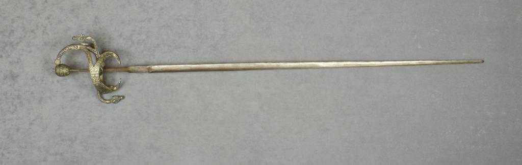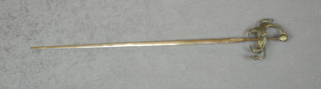 Composite sword with old forged blade approx.  35” overall attached to a later, possibly  Victoria era cast brass ornate guard and  pommel; grip missing.  Est.:  $150-$250.