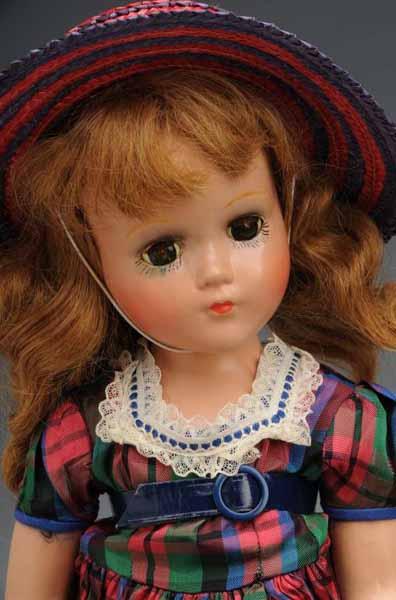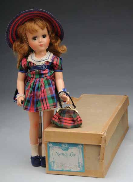 Description American, Ca. 1940. Impressed R & B. All composition and totally factory original. Sleeping eyes with perfect eyelashes have been oiled, and eyelashes appear repainted and smudged. Original human hair wig with bangs, closed mouth. Original plaid dress with belt, purse, wristlet, straw hat, shoes and socks. In original Nancy Lee box. Condition (Very Good). Size 17" T.
